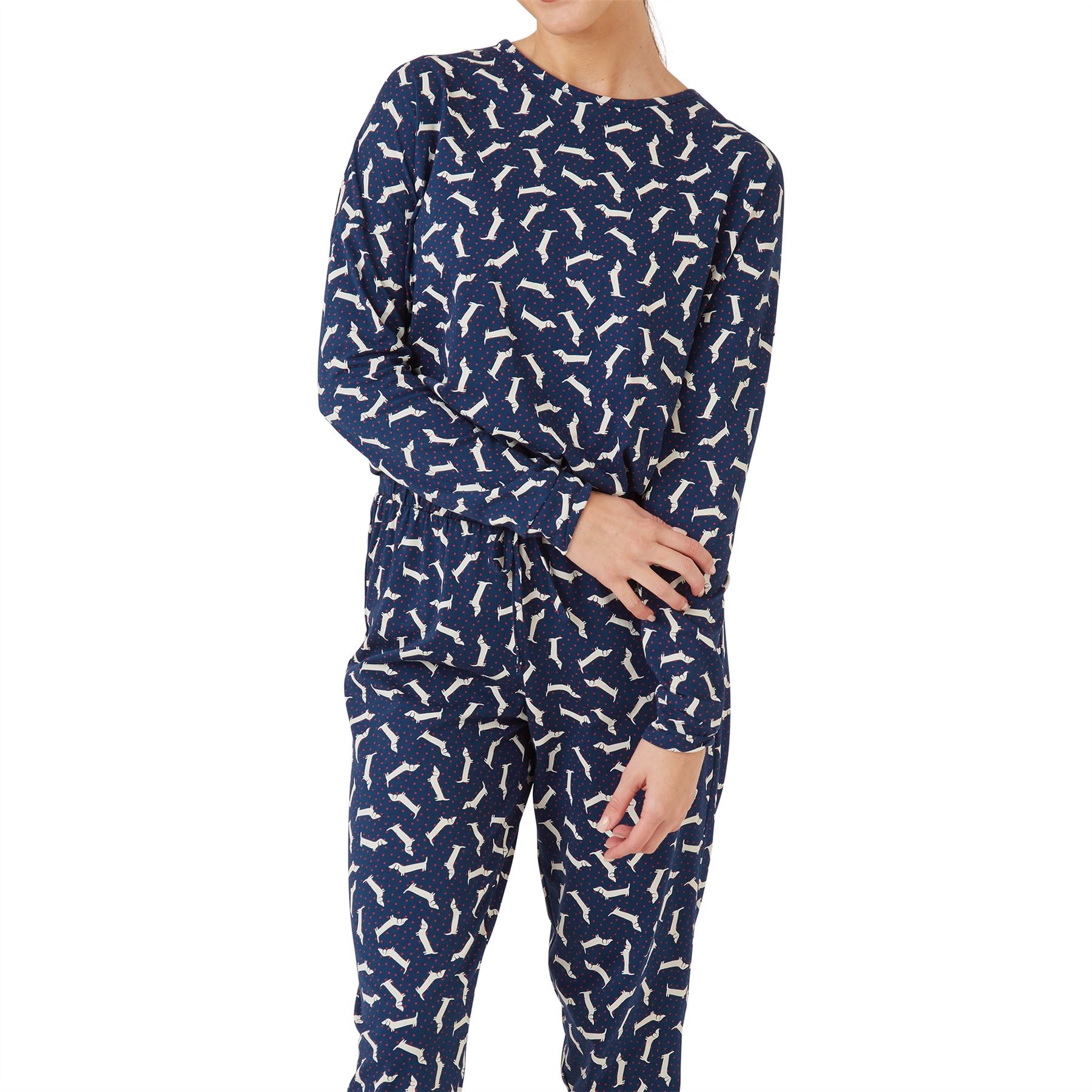 Women's jersey cotton pyjamas in navy, featuring all over dachshund dog print. The set features a crew neck top and cuffed bottoms, with an elasticated waist and mock drawstring.