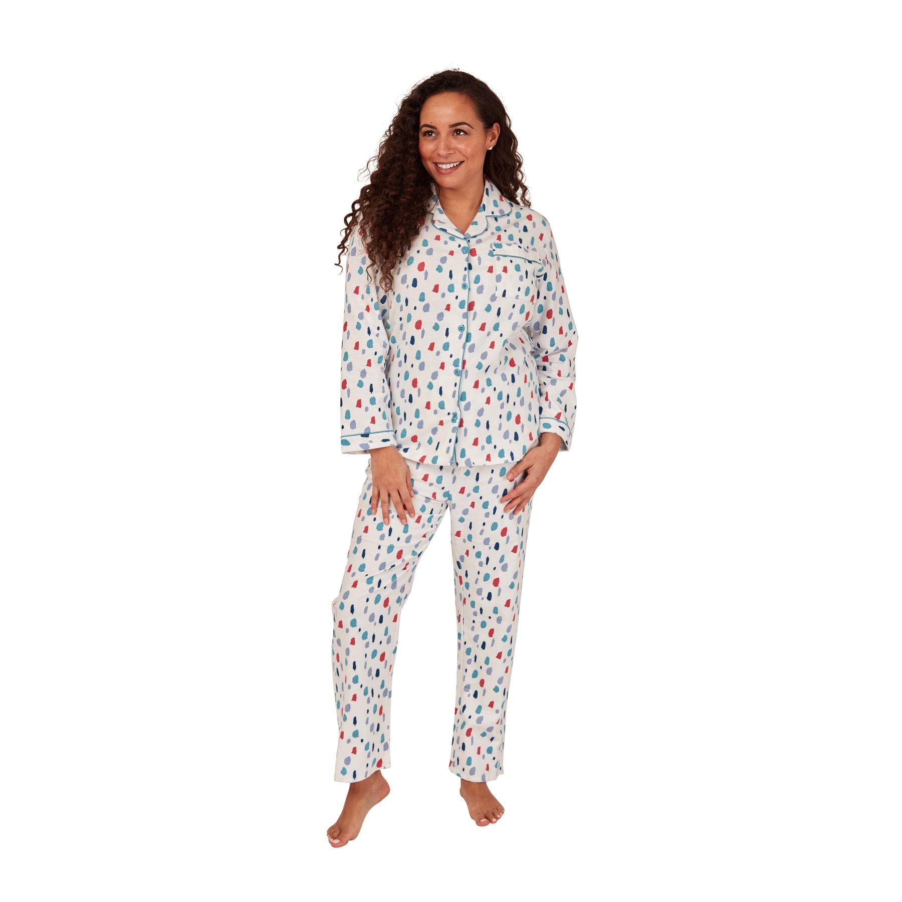 Women's brushed cotton pyjama set in ivory, featuring splat spot print, with a button through front.