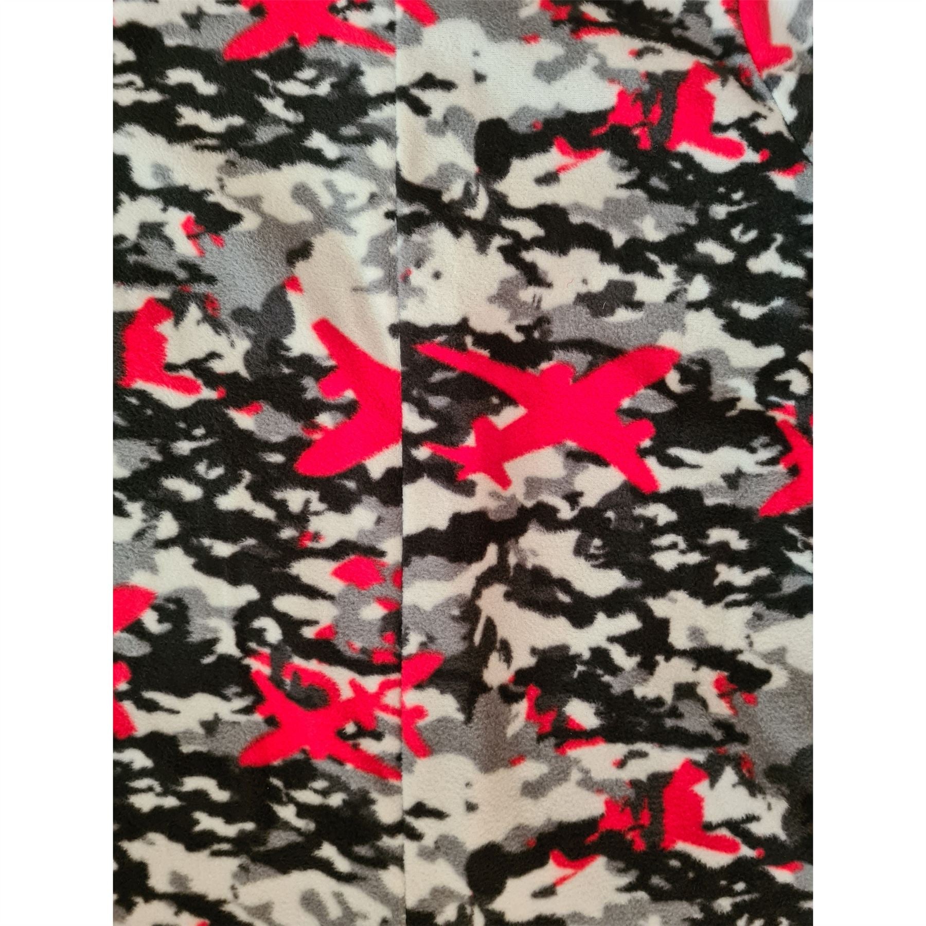 Kids' microfleece hooded onesie with camo print in grey. It has ribbed ankles and cuffs and a zip up front. The camouflage print features planes.