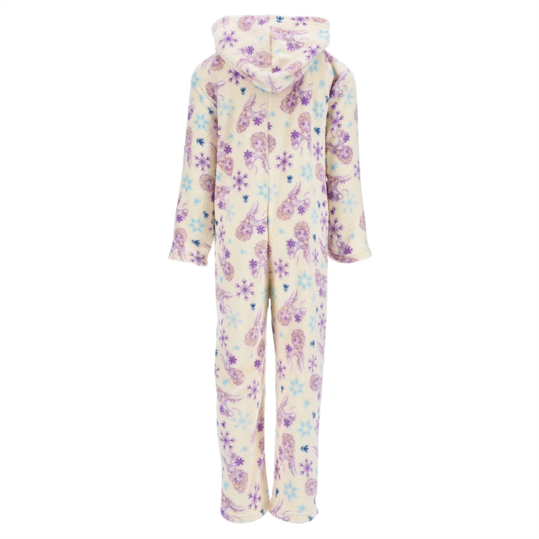 Kids' Disney Frozen Elsa fleece onesie in beige with a hood. Please note - hooded garments should never be worn while sleeping.