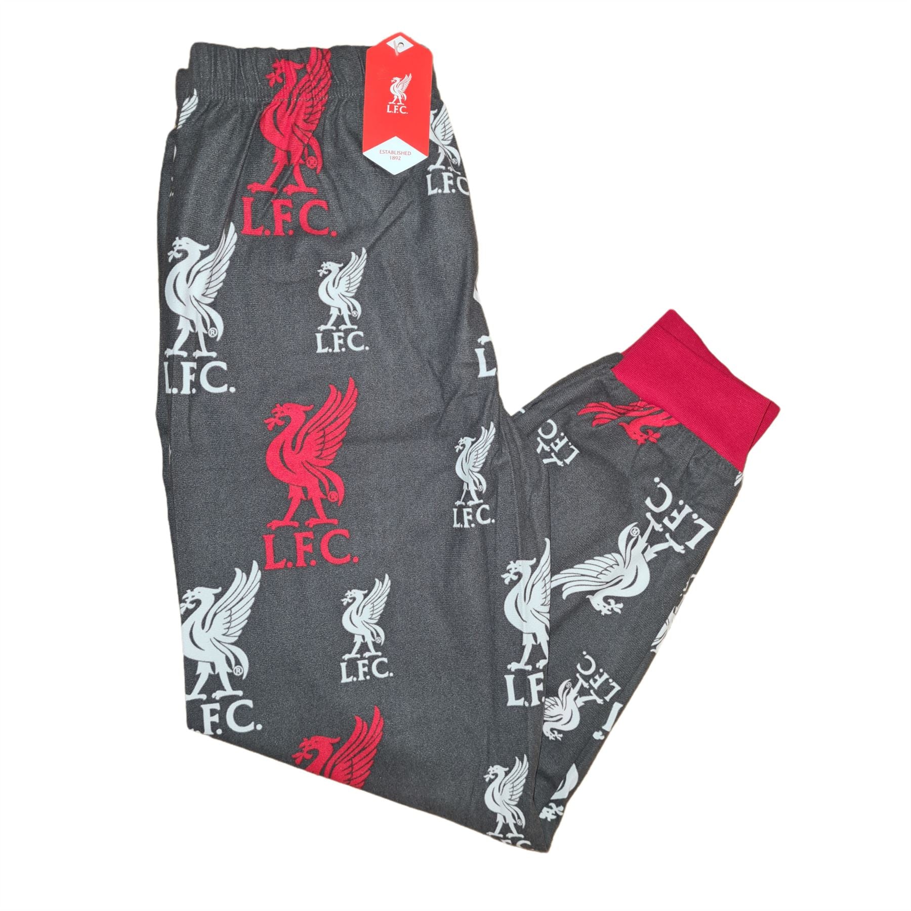 Kids' official Liverpool lightweight brushed tricot fleece cuffed bottoms with club logo print.