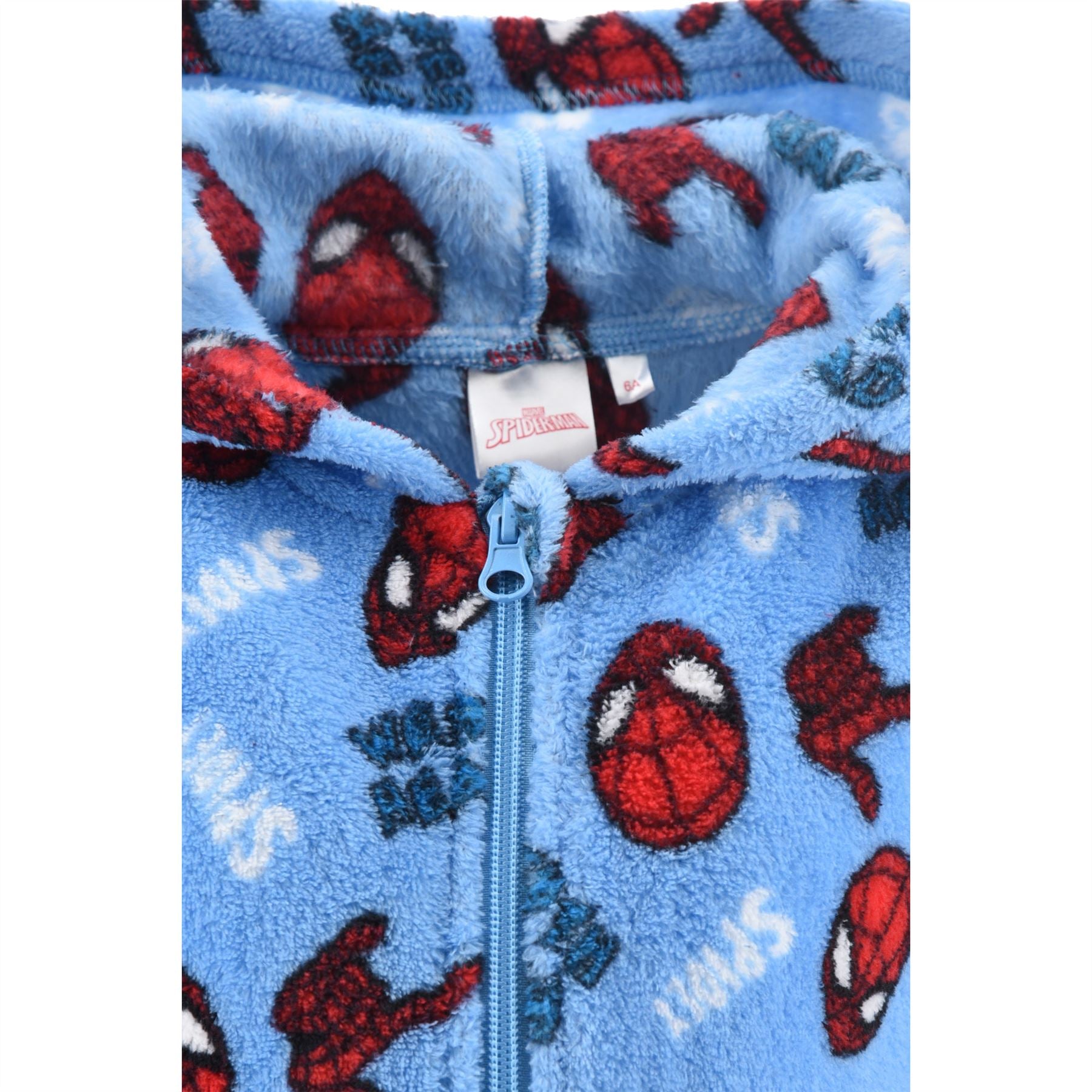 Kids' fleece Spiderman onesie in blue with printed detail, a hood and zip through front. Please note - hooded garments should never be worn while sleeping.