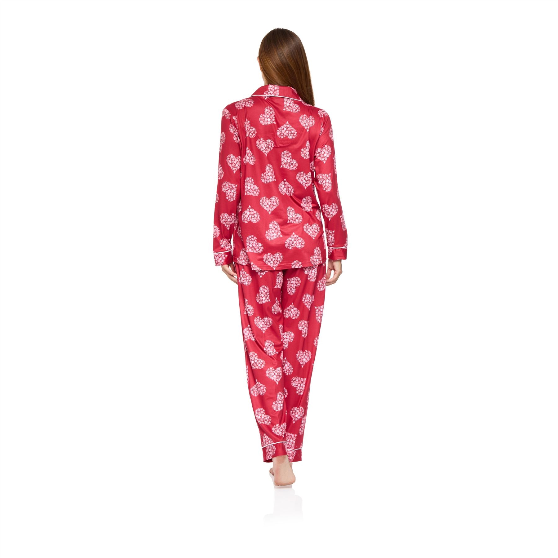 Women's jersey knit pyjama set in red, with starry love print. The two piece set is made from lightweight, soft, brushed jersey fabric. It features a long sleeve button through top and elasticated bottoms.