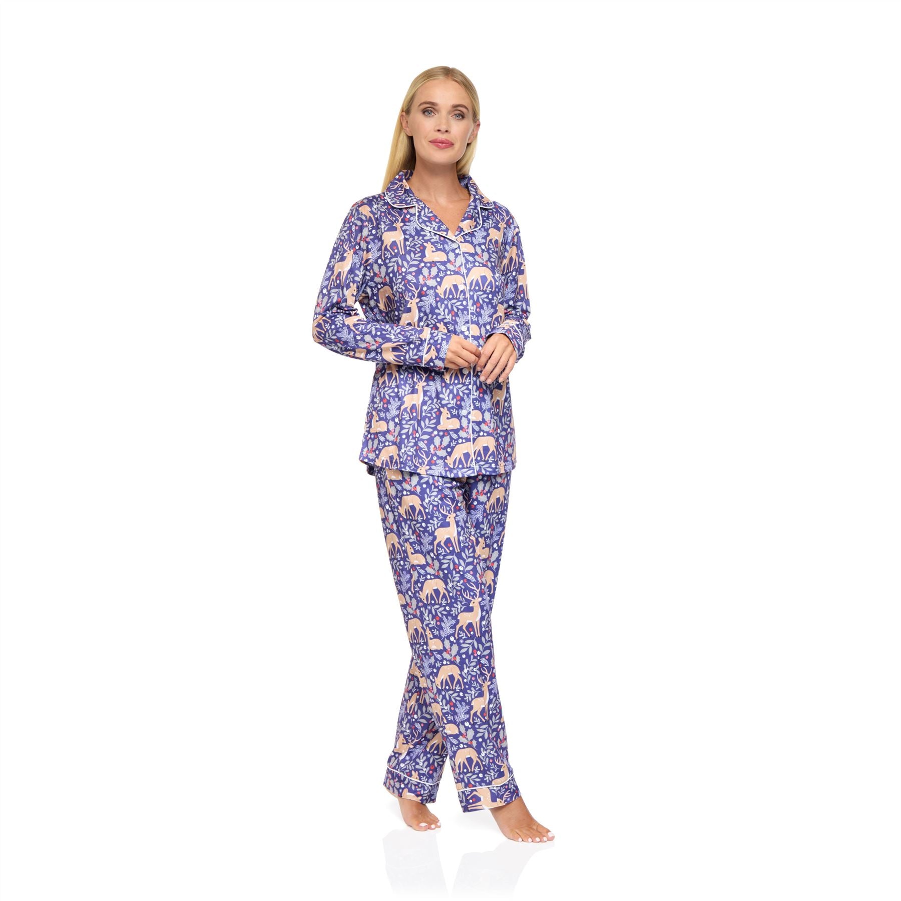 Women's jersey knit pyjama set in blue, with winter fawn print. The two piece set is made from lightweight, soft, brushed jersey fabric. It features a long sleeve button through top and elasticated bottoms.