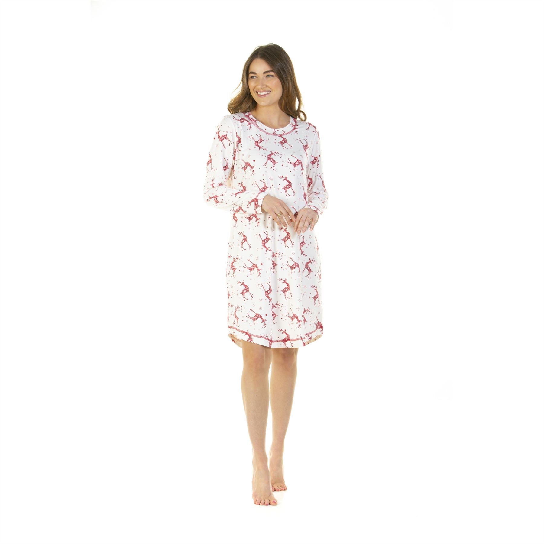 Women's jersey knit long sleeve nightdress in ivory with reindeer print. It is made from lightweight, soft, brushed jersey fabric.
