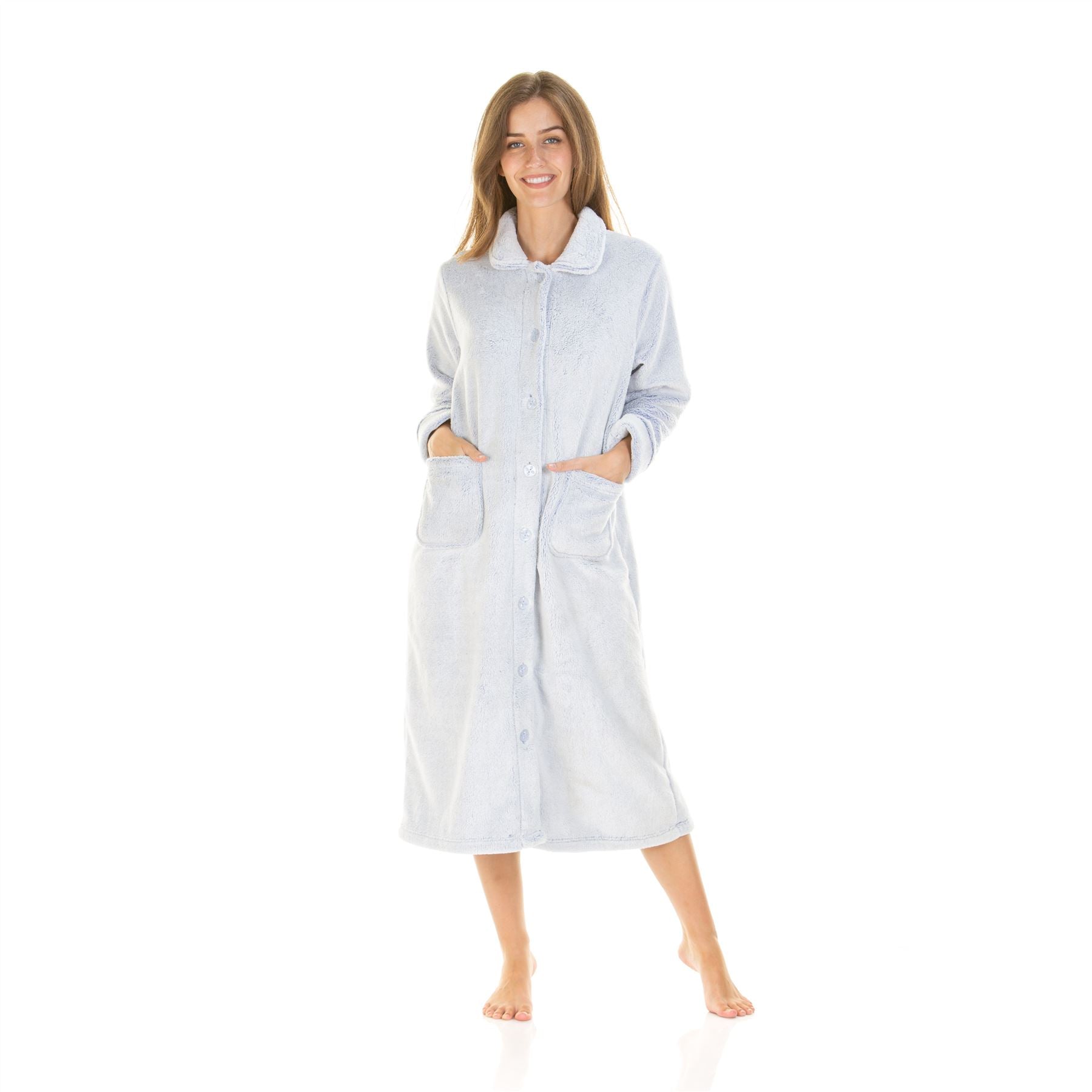 Women's luxury longpile fleece robe in blue, with a button through front and a pocket each side.
