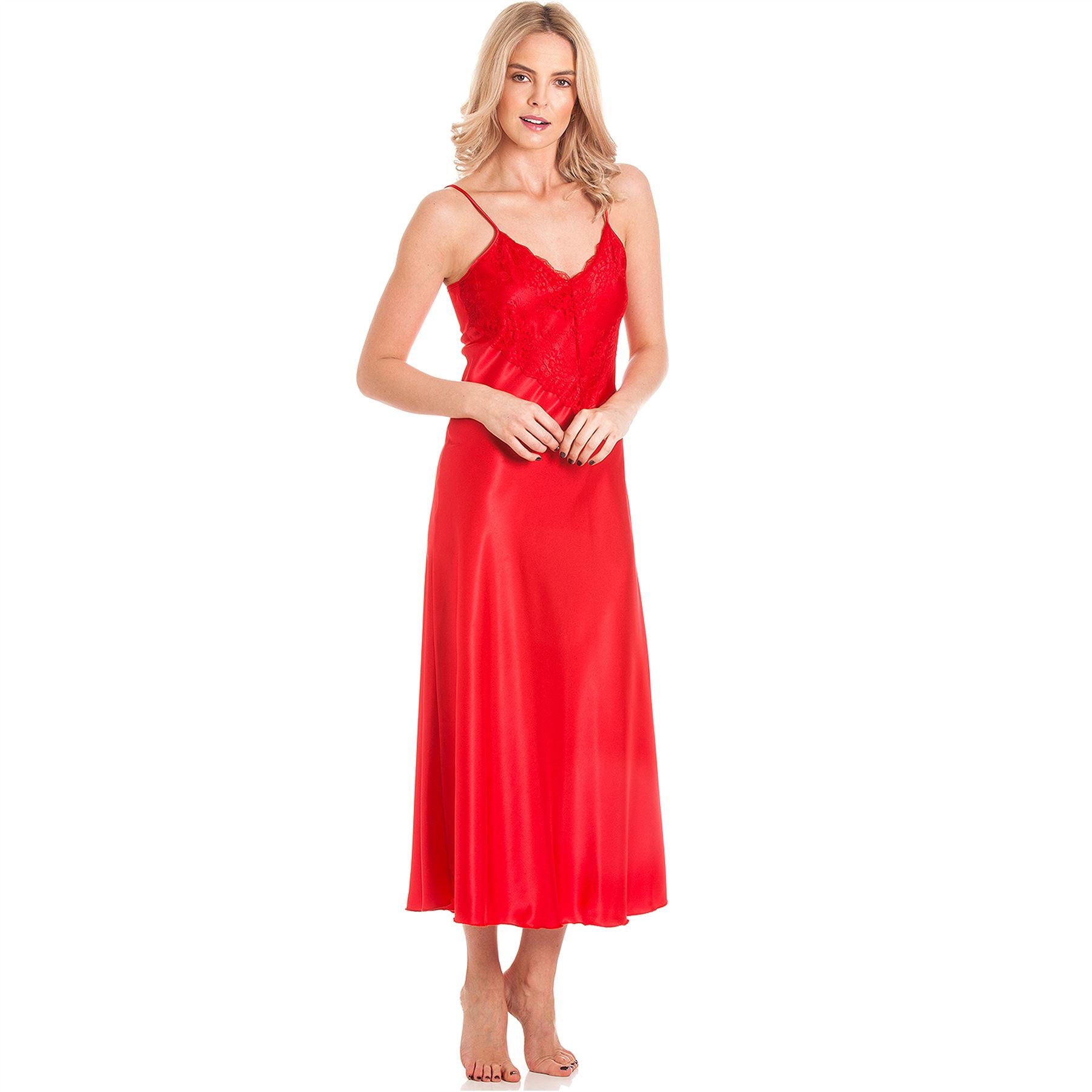Women's long satin nightdress in red, with spaghetti straps and lace detail. The straps are not adjustable.