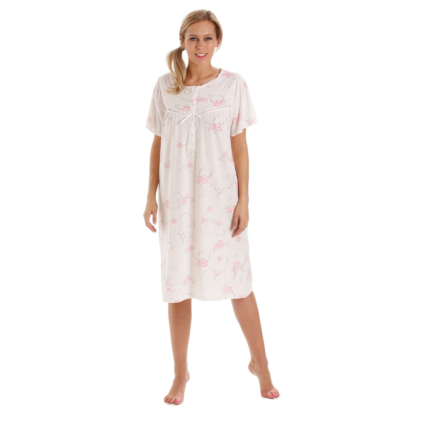 Lady Olga women's jersey short sleeve nightdress in pink, featuring easy iron soft fabric, floral print, lace/ribbon detail and four button placket front.