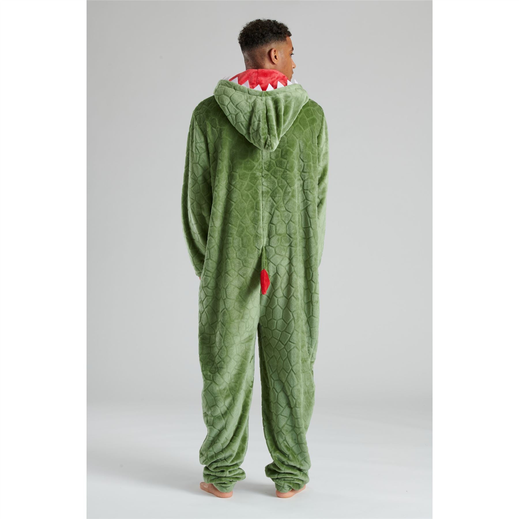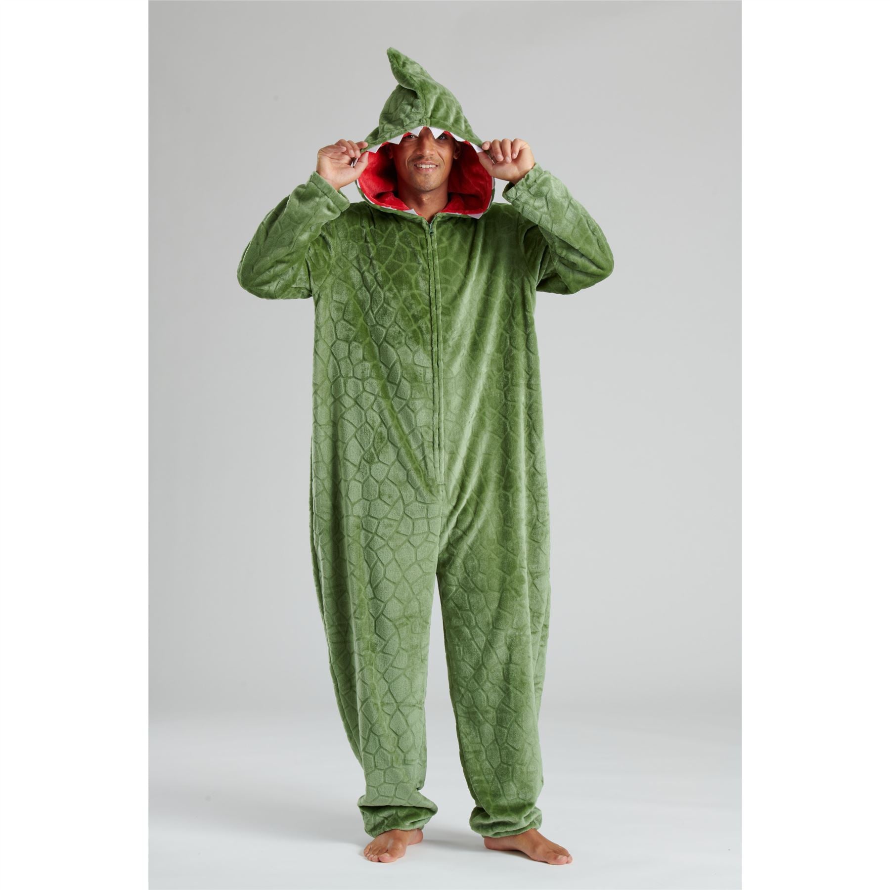 Men's green dinosaur fleece onesie, with a scale design, zip up front and novelty hood.