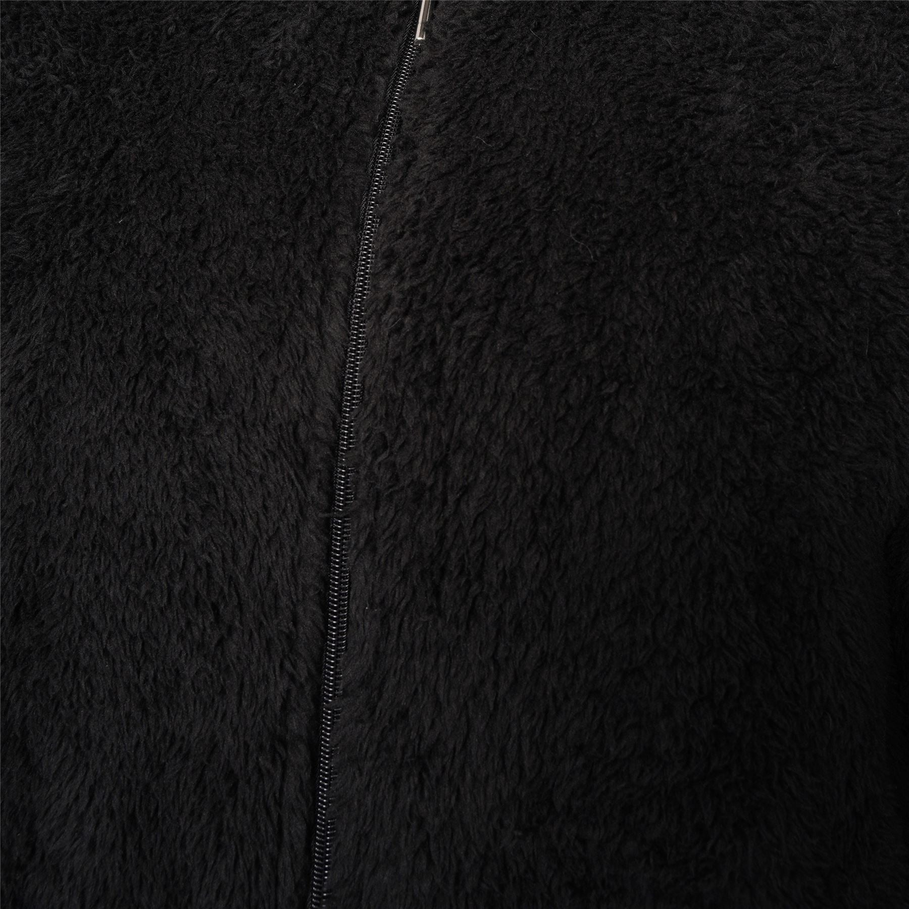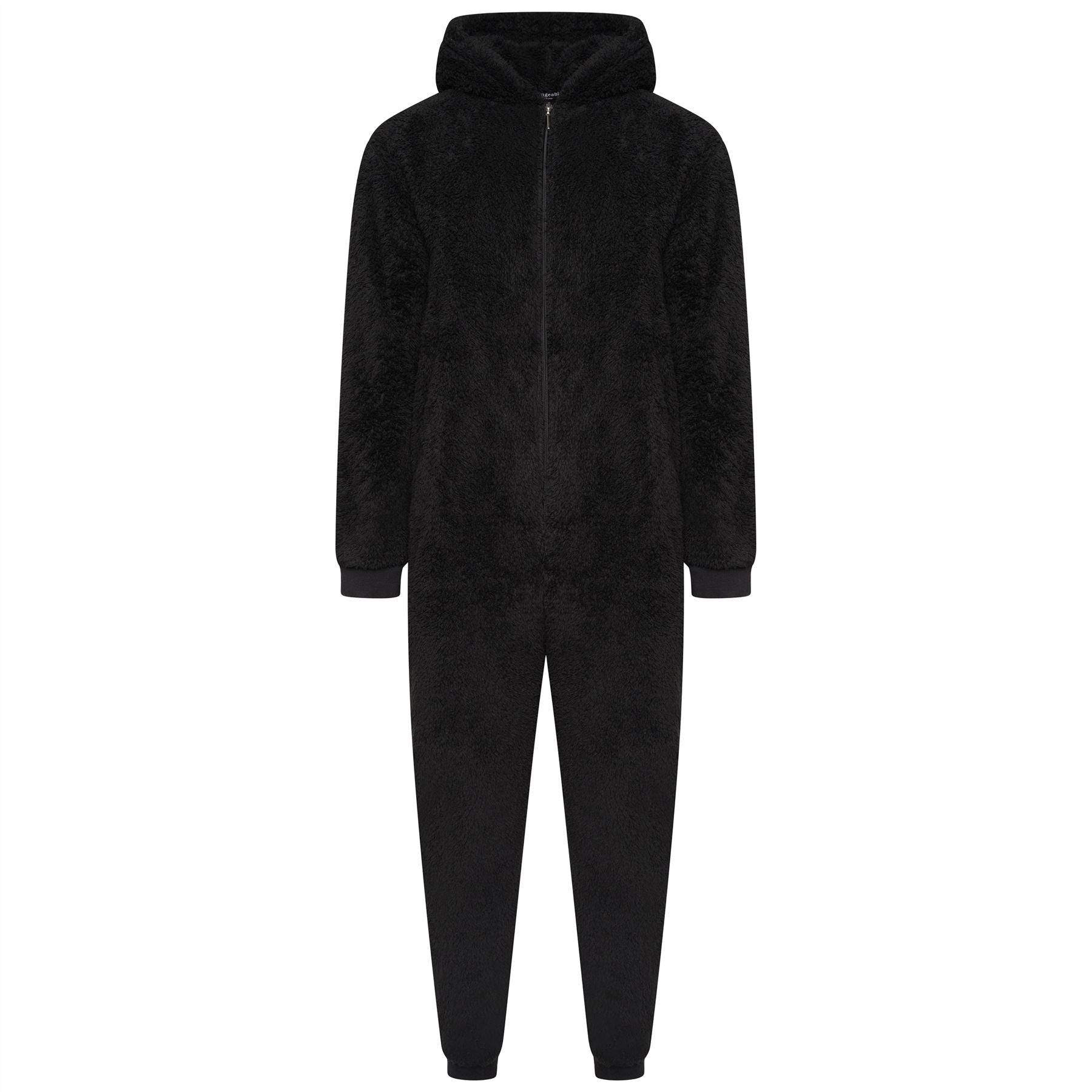 Men's black sherpa fleece onesie. It is hooded, with ribbed cuffs and ankles and a zip up front.