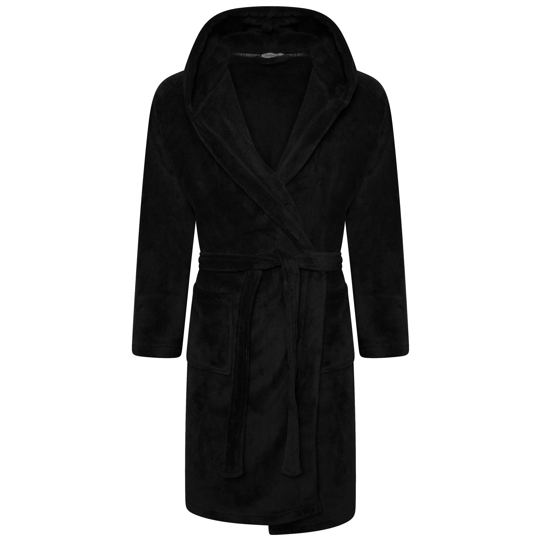 Men's 300 GSM super soft black fleece robe, with shawl collar, a pocket each side and a cord tie fastening.