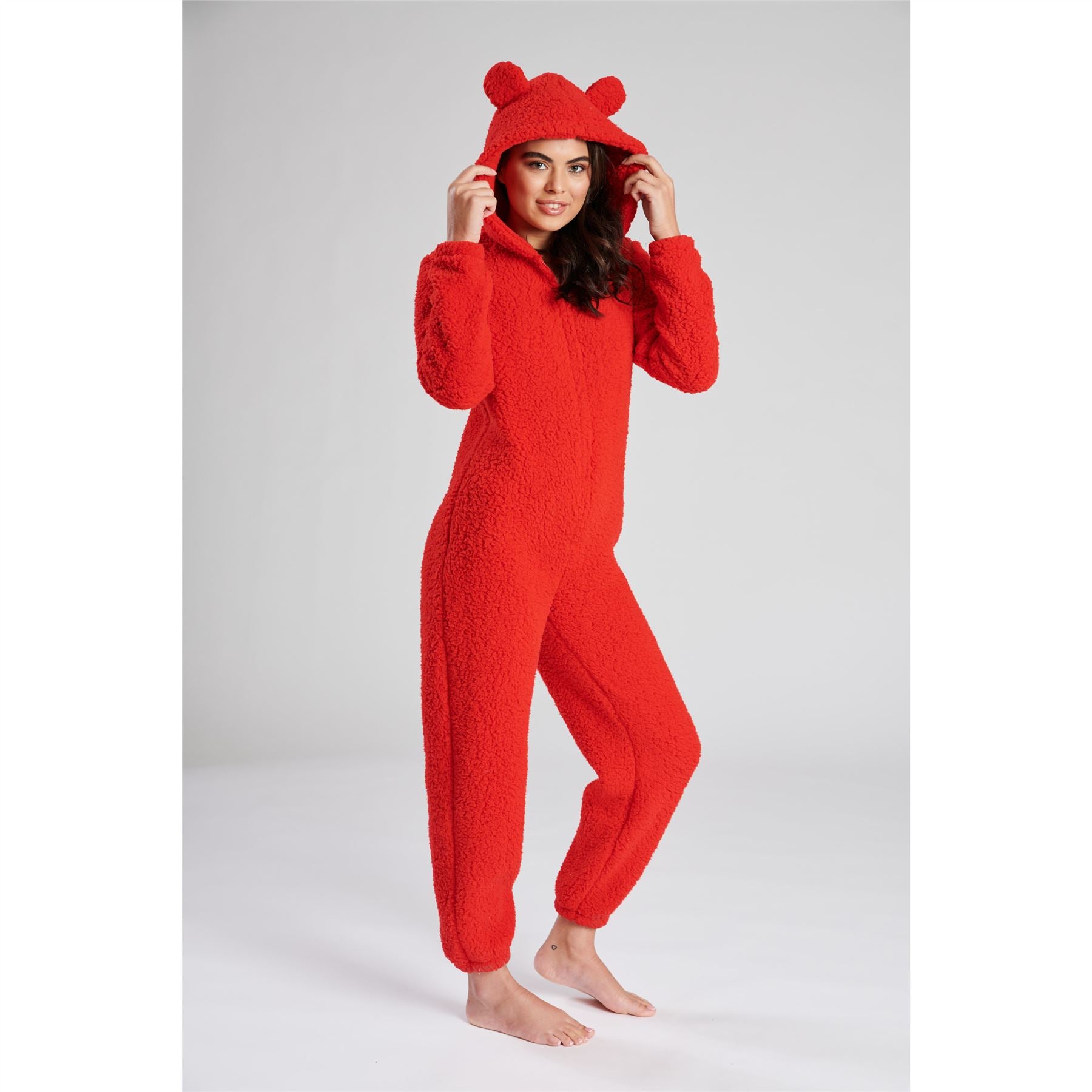 Women's borg fleece onesie in red. It has a zip up front and a hood with ears.
