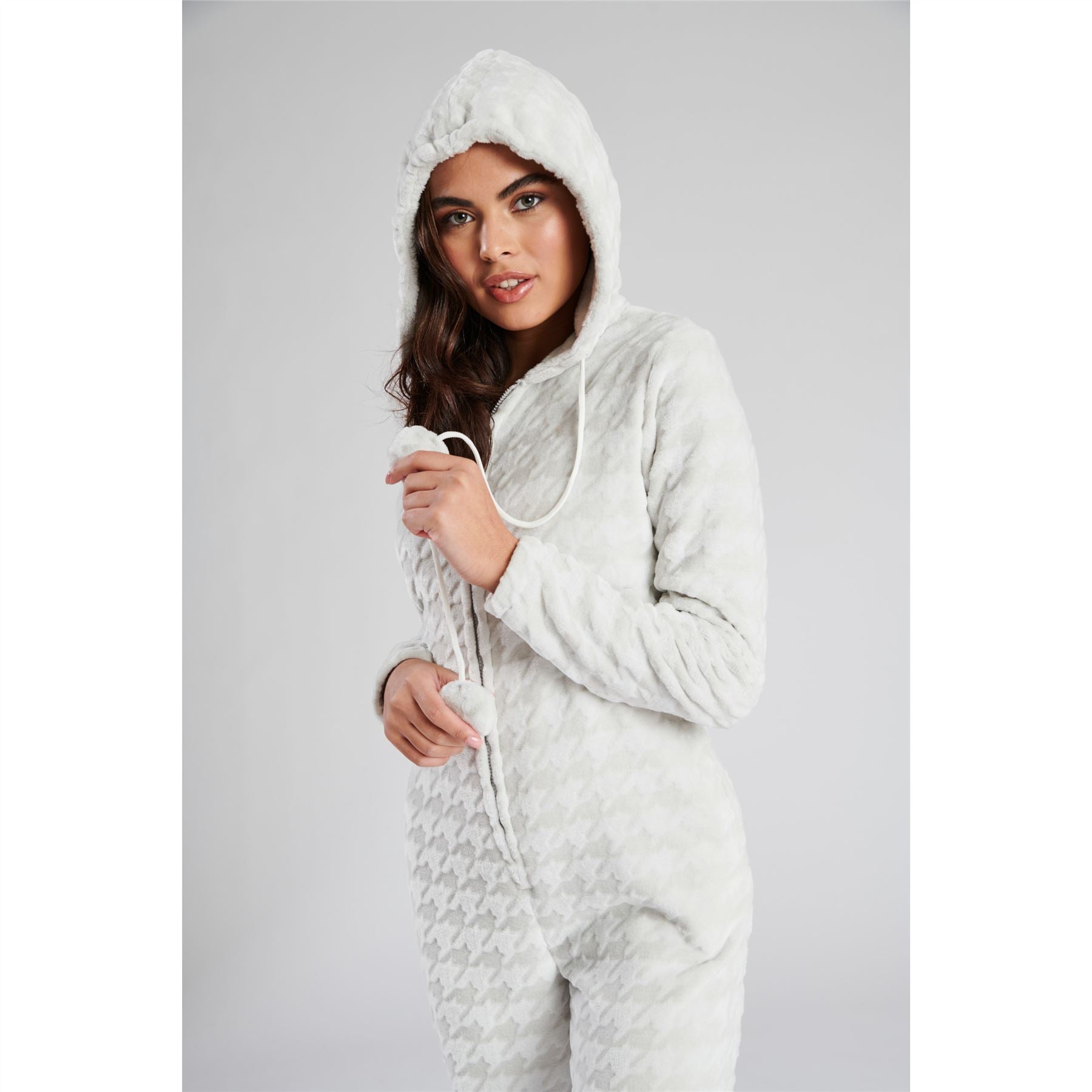 Women's houndstooth fleece onesie in grey. It has a zip up front, pom-pom detail and a hood.