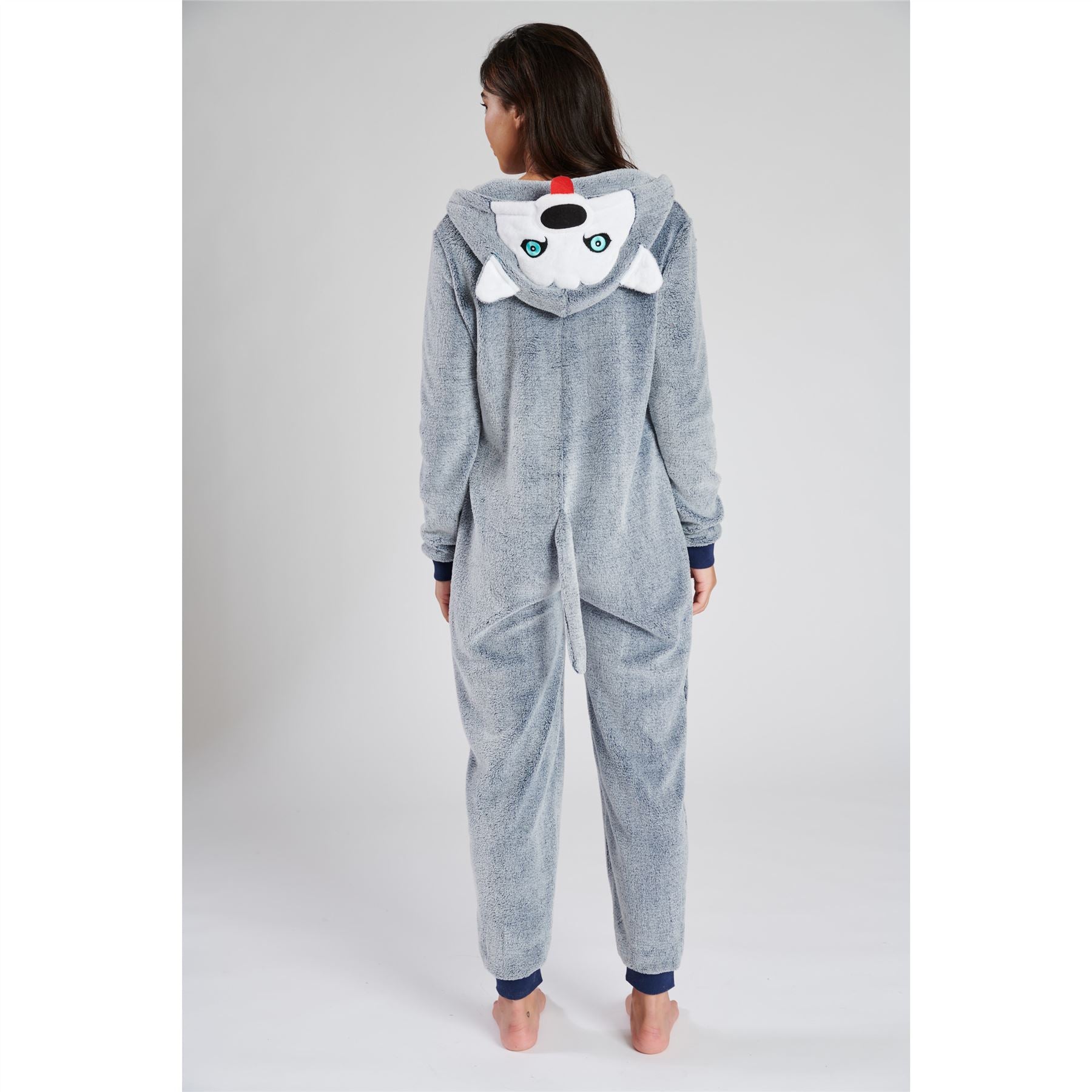Women's husky dog fleece onesie in blue/grey. It has a zip up front, ribbed cuffs and ankles and a novelty hood.