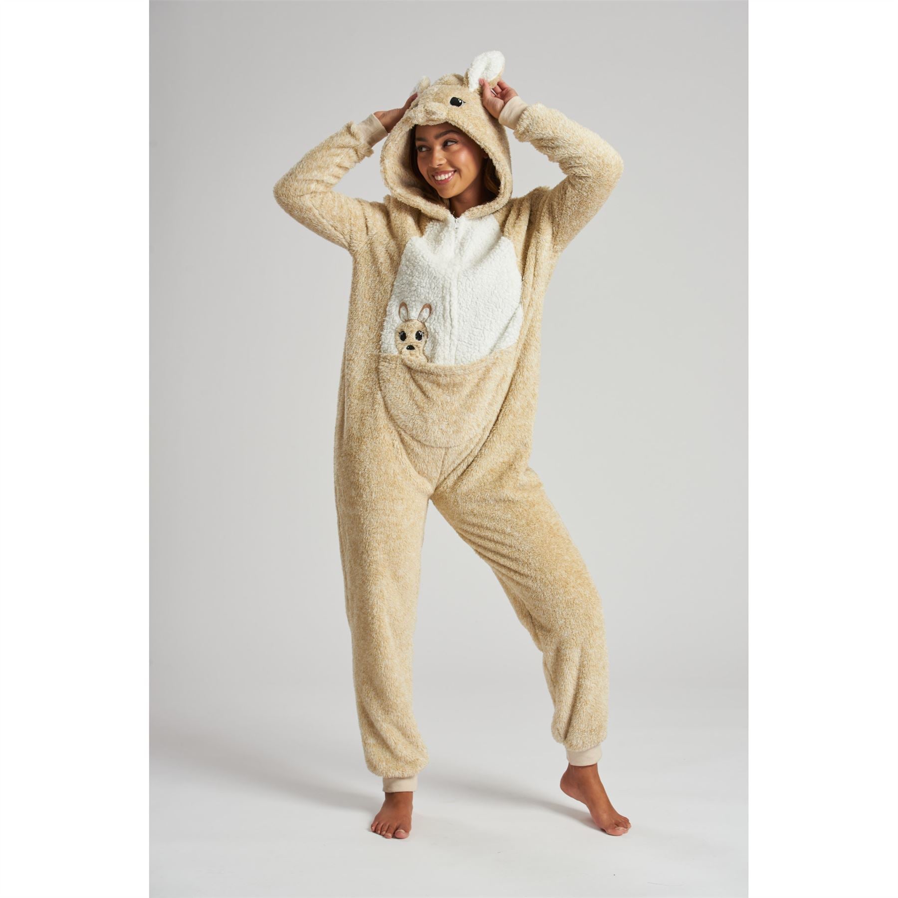 Women's marl fleece kangaroo onesie with a novelty hood, pouch pocket and zip through front. Small (8-10), Medium (12-14), Large (16-18), Extra Large (20-22).