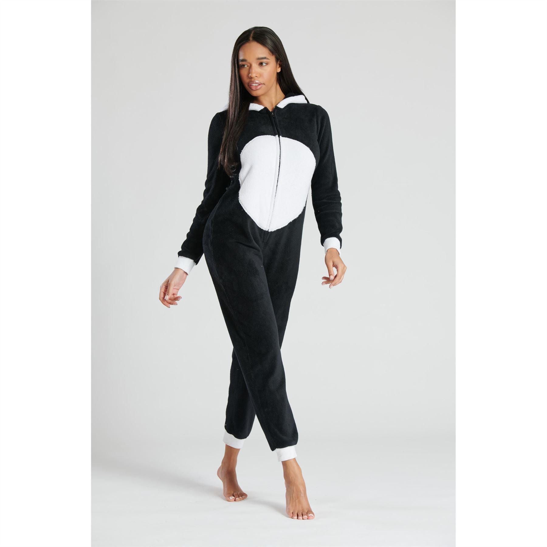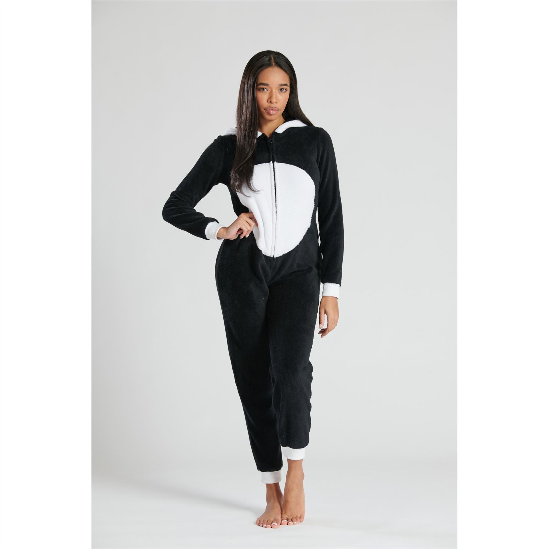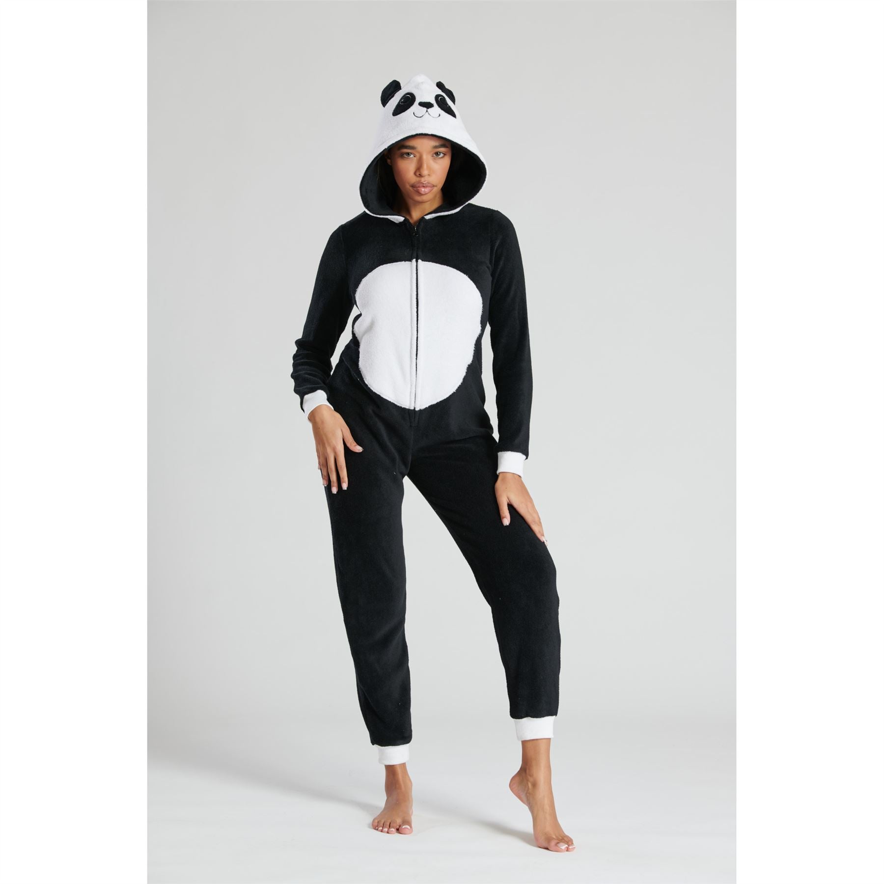 Women's novelty panda fleece onesie in black/white with a 3D hood. It has a zip up front, and ribbed cuffs and ankles.