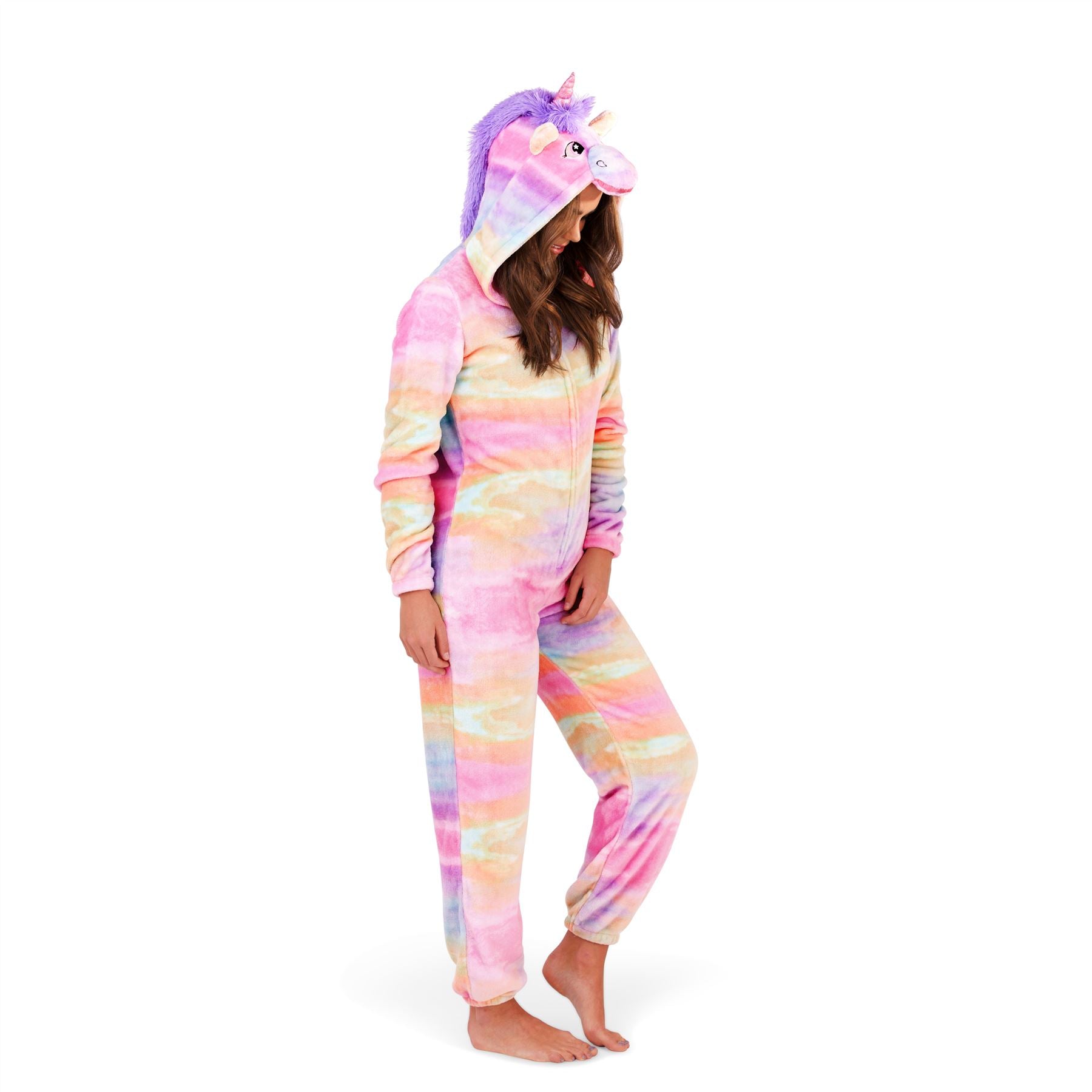 Women's novelty unicorn fleece onesie in rainbow print with a 3D hood. It has a zip up front, and ribbed cuffs and ankles.