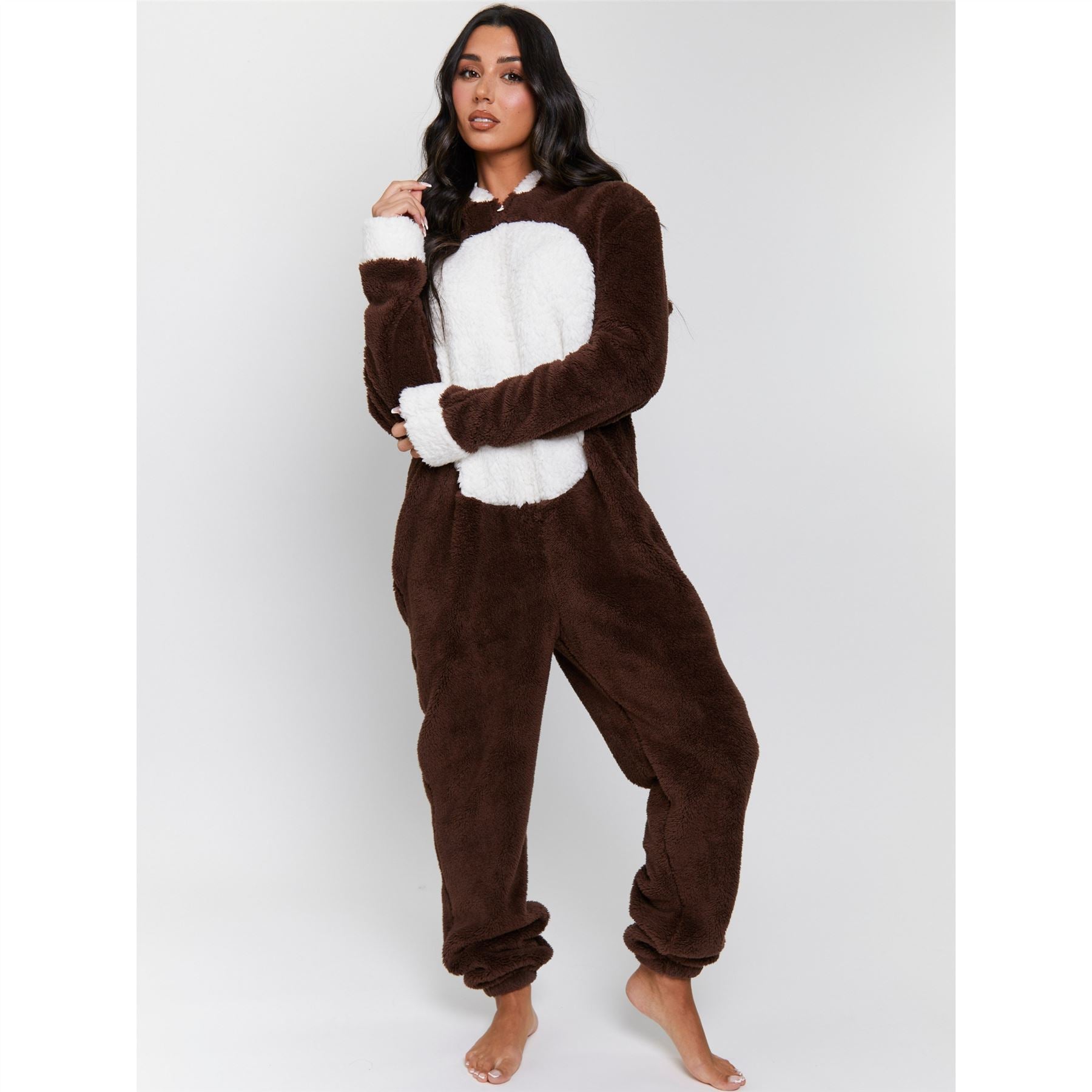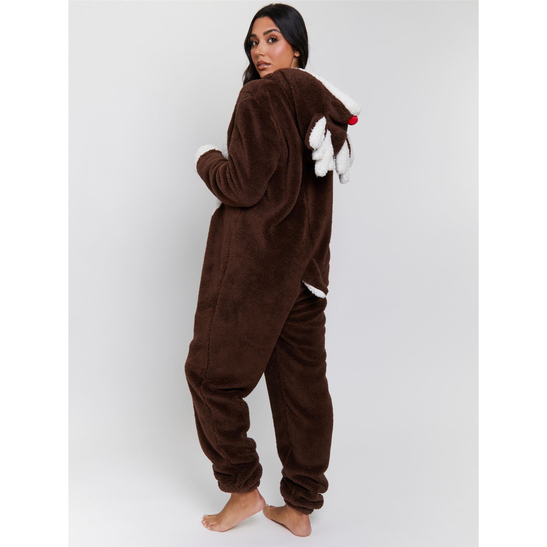 Women's reindeer onesie in brown/white, with a novelty hood. It has a zip up front, contrasting sherpa fleece detail and a tail.