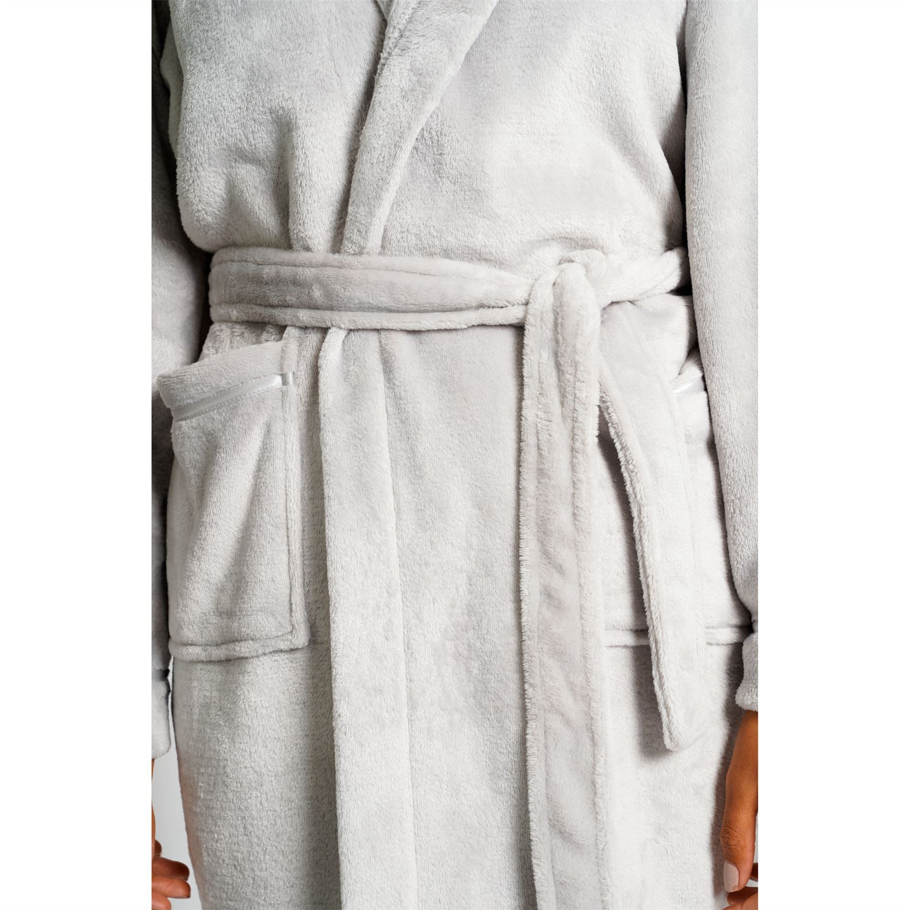 Women's luxury fleece robe with a hood, in silver. It has satin trim detail, pockets and a cord tie fastening.