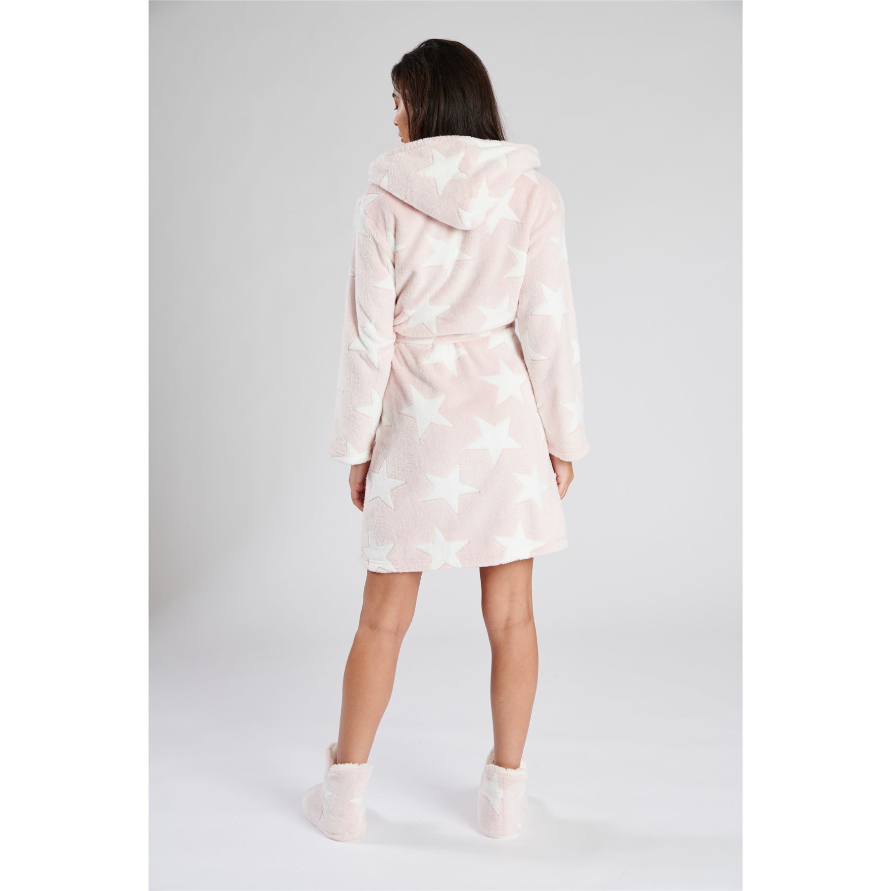 Women's star embossed fleece robe in pink, with a hood, pockets and a cord tie fastening.