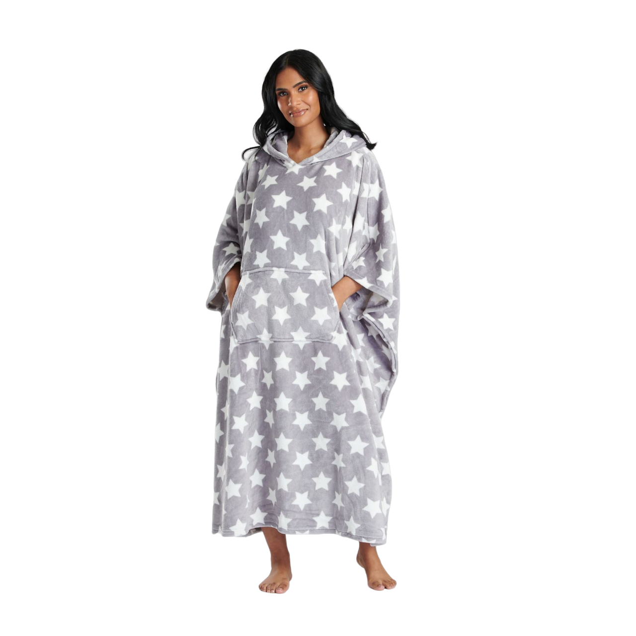 Women's luxury grey fleece poncho with star print, a hood and a kangaroo pocket at the front. One size fits most.