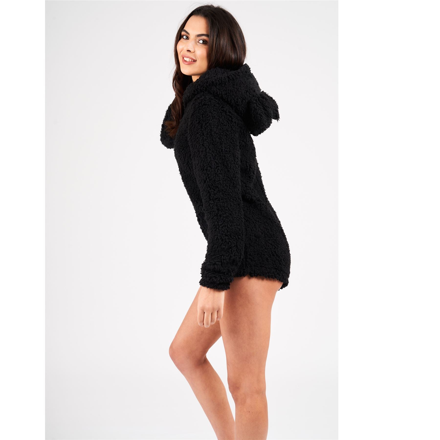 Women's sherpa fleece teddy bear shortie romper onesie, in black. It has a zip up front and a novelty hood.
