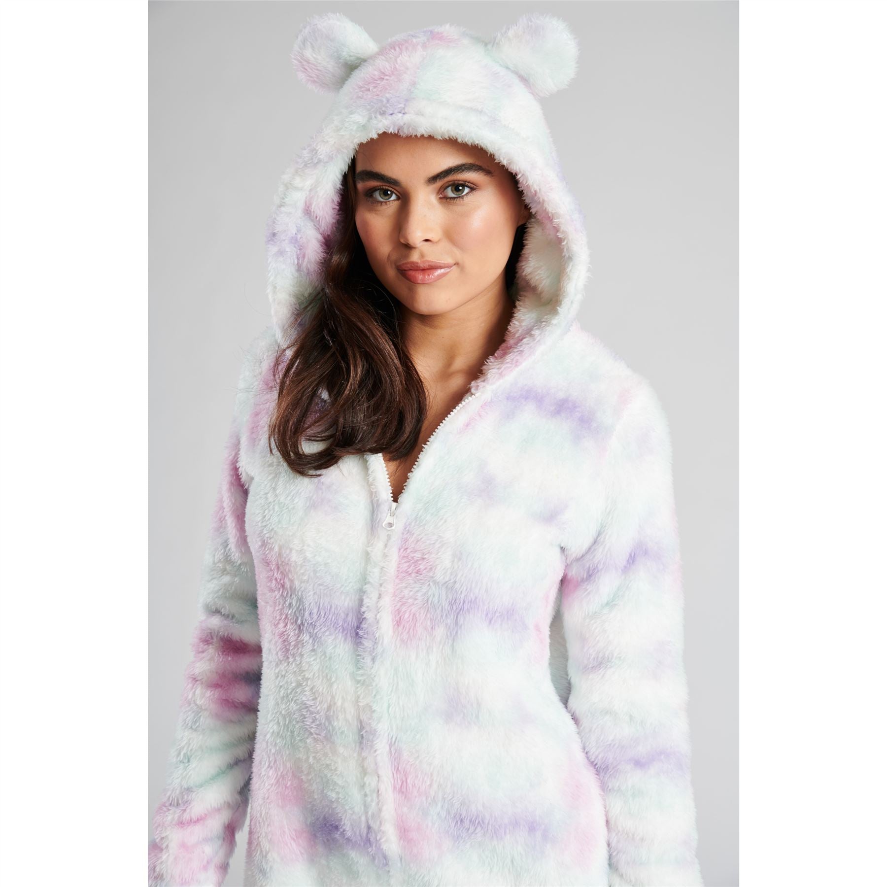 Women's tie dye sherpa fleece onesie in pastel. It has a zip up front and a hood with ears.