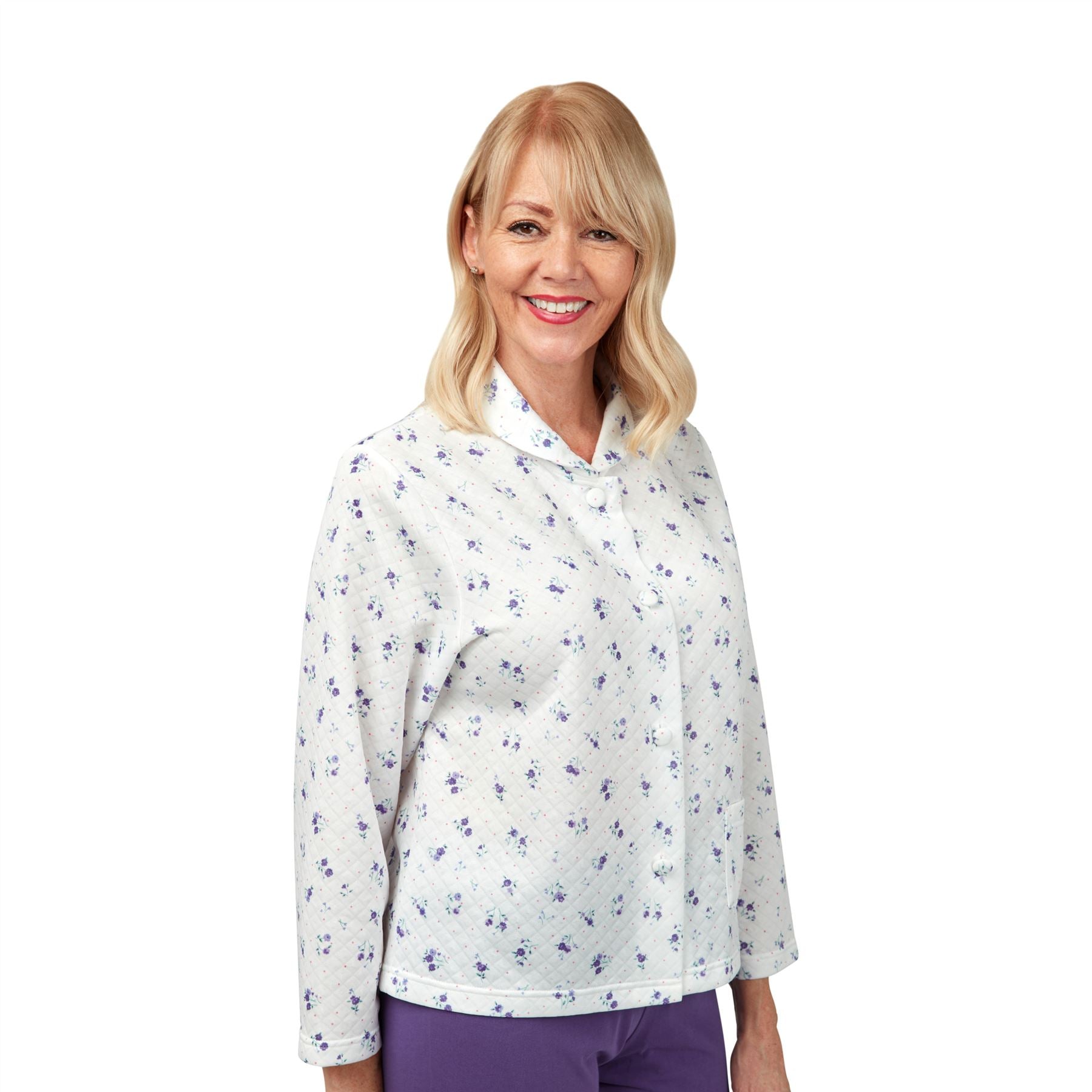 Women's lightweight mock quilt bedjacket in white/blue, with floral detail, a button through front and patch pocket.
