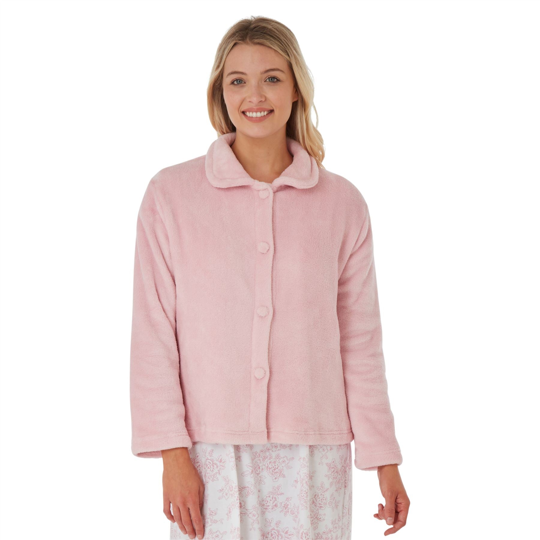 Women's coral fleece bedjacket in pink, with a button through front and a pocket each side.