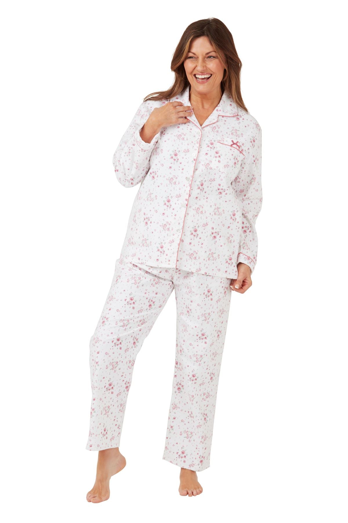 Women's brushed cotton pyjama set in white/pink, featuring floral print and button through front.
