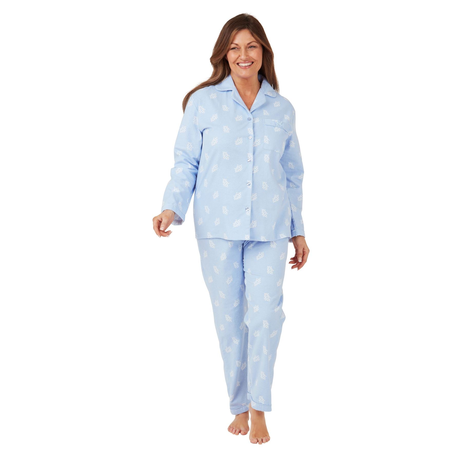 Women's brushed cotton pyjama set in blue, featuring leaf print and button through front.