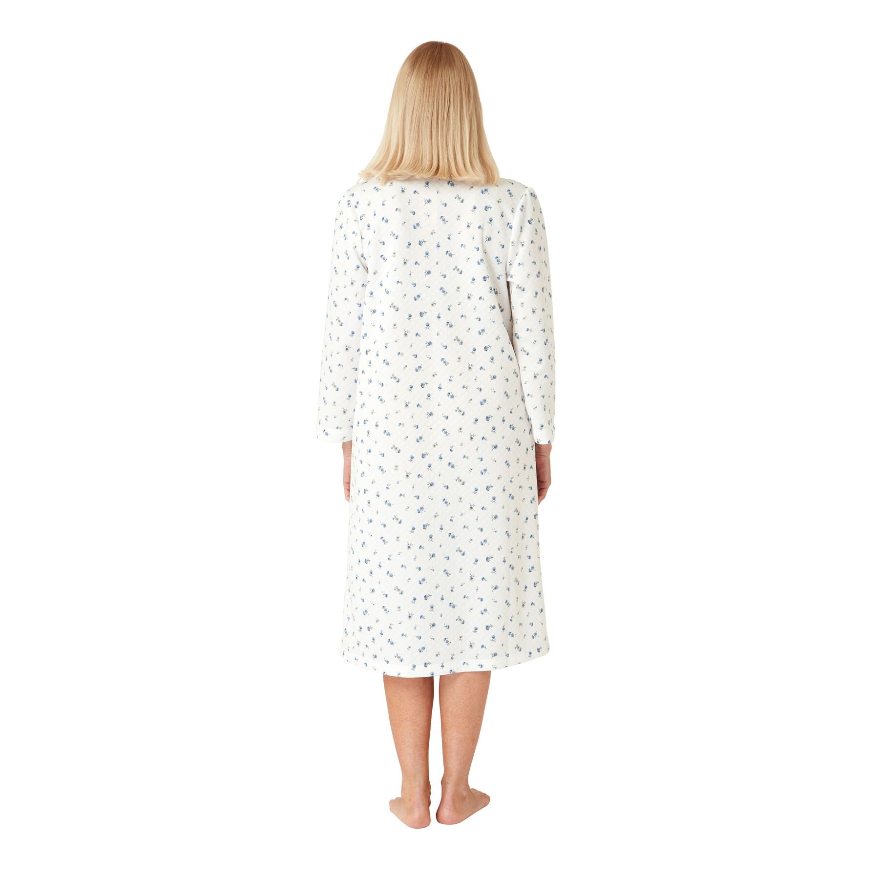 Women's lightweight mock quilt housecoat in white/blue, with floral detail and a zip through front.