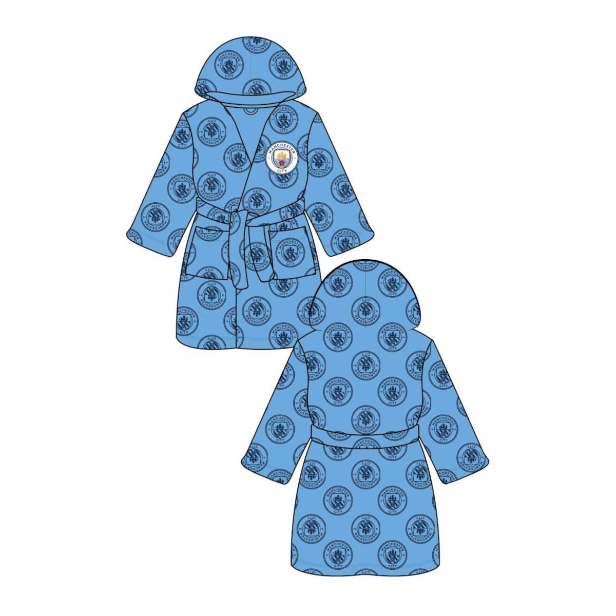 Men's official Manchester City Football Club fleece robe, with a hood, pockets and belt fastening.