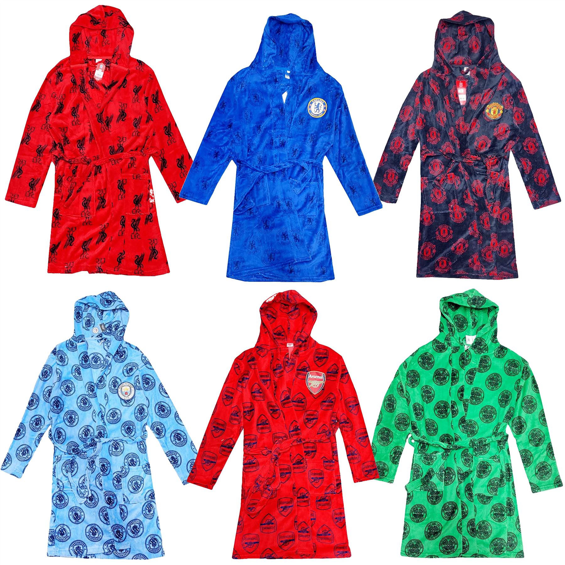 Men's official Manchester United Football Club fleece robe, with a hood, pockets and belt fastening.