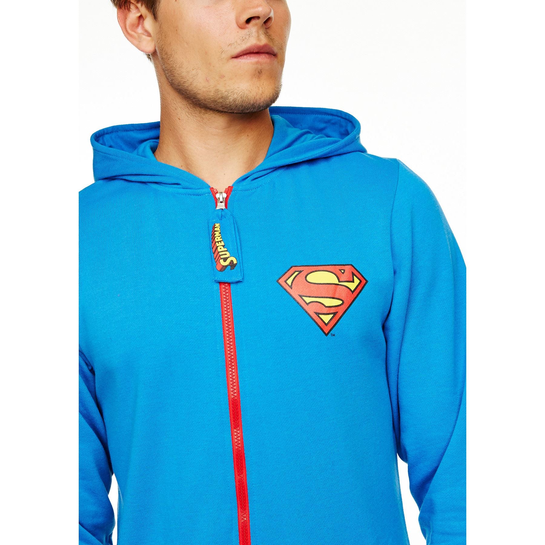 Men's official licensed Superman jogger style onesie, with a zip through front, pockets and logo detail on the front and back.