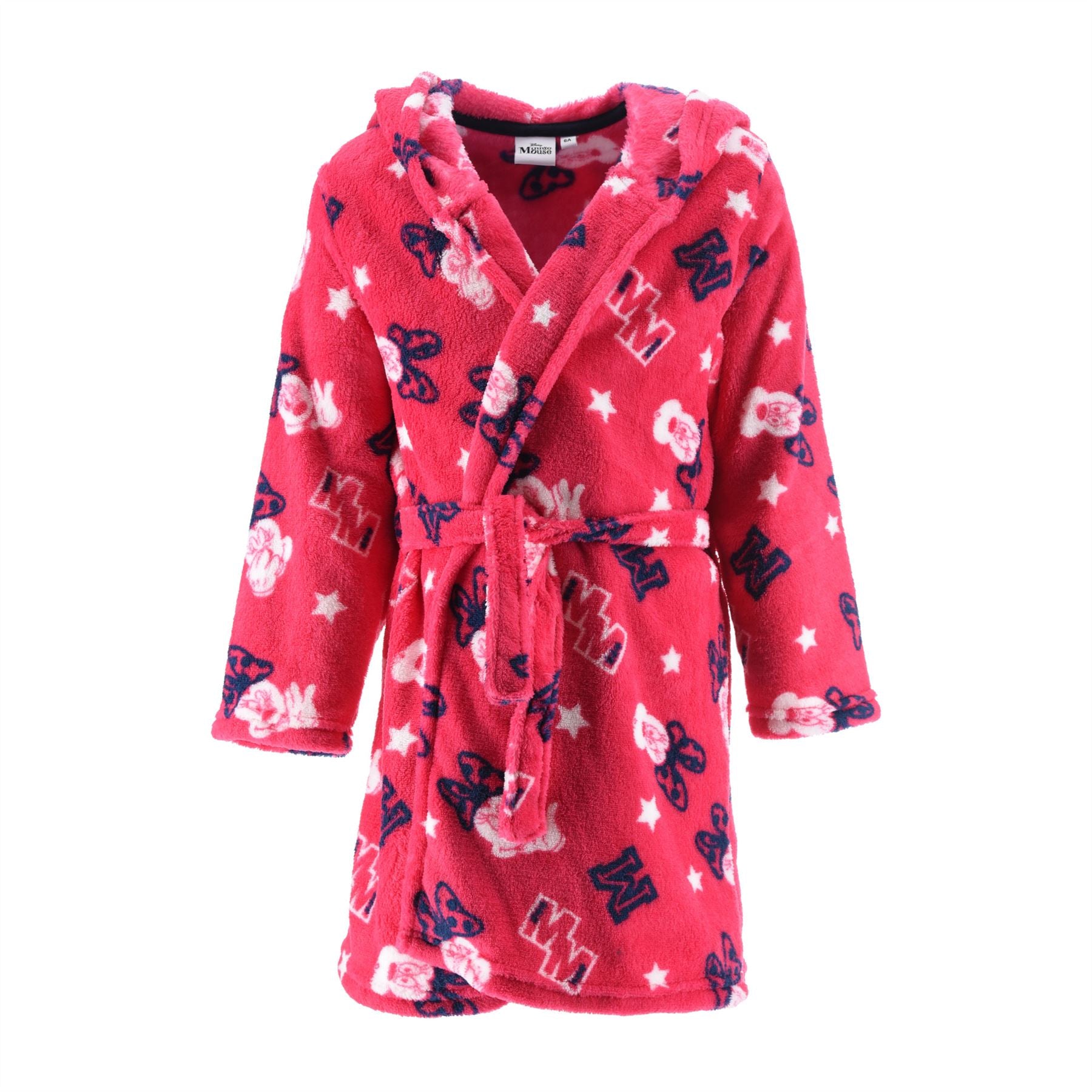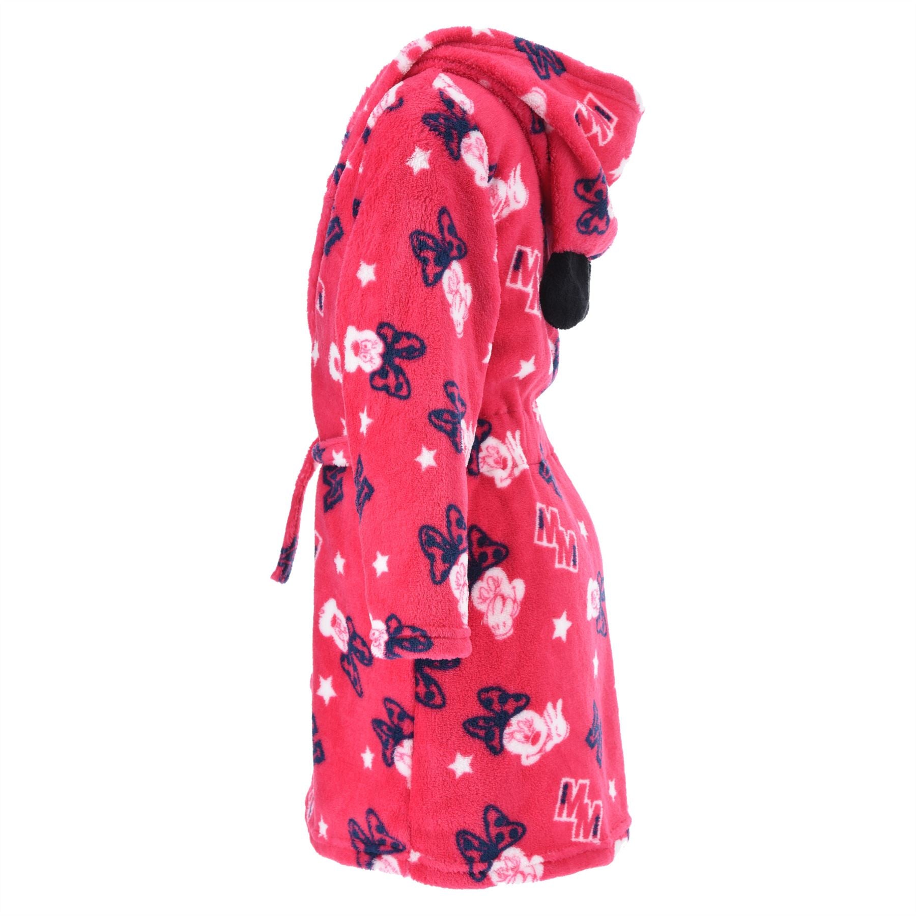 Kids' Minnie Mouse hooded fleece robe with printed detail, in fushia. It has pockets and a matching tie belt.