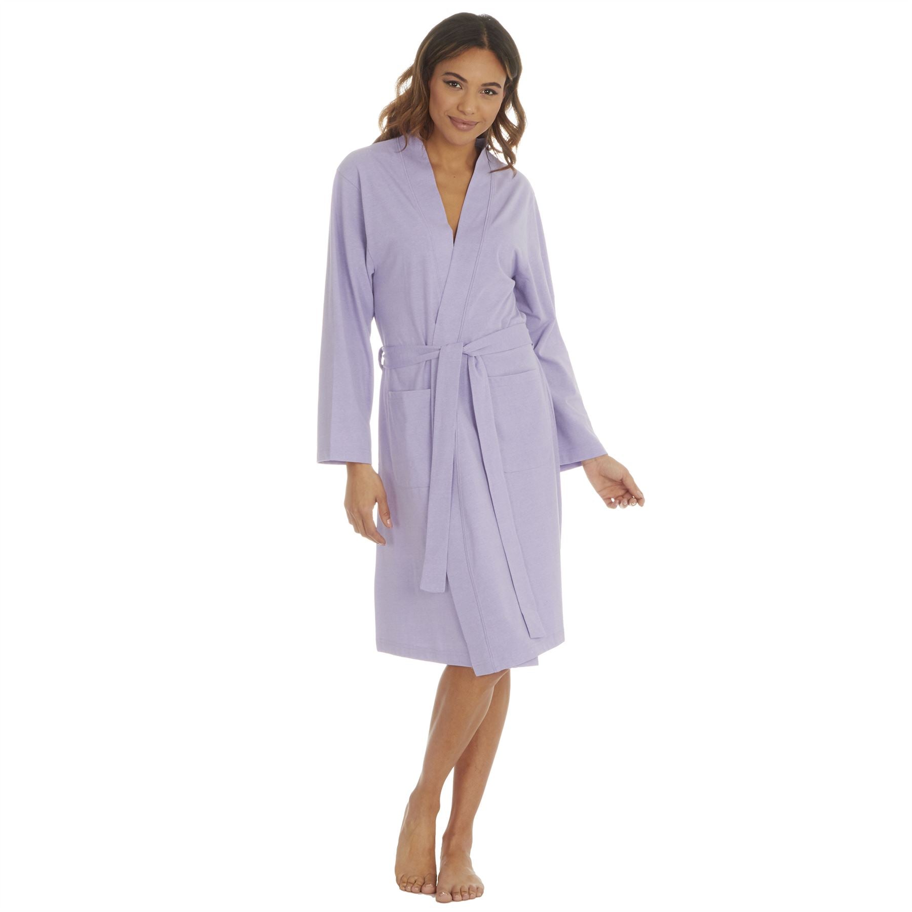 Women's lightweight jersey kimono robe, in lilac, with a pocket each side and a cord tie fastening.