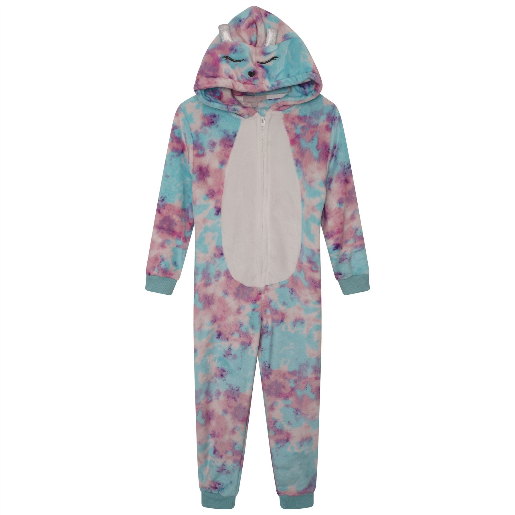 Kids' multicoloured butterfly fleece onesie with a zip up front and novelty hood.