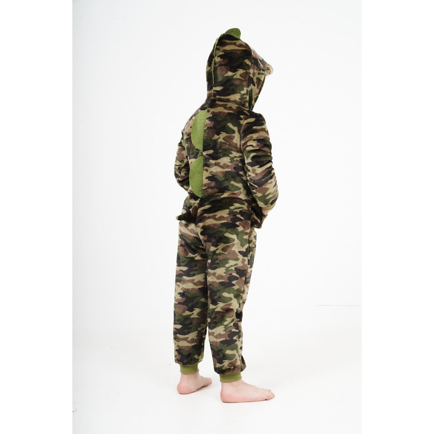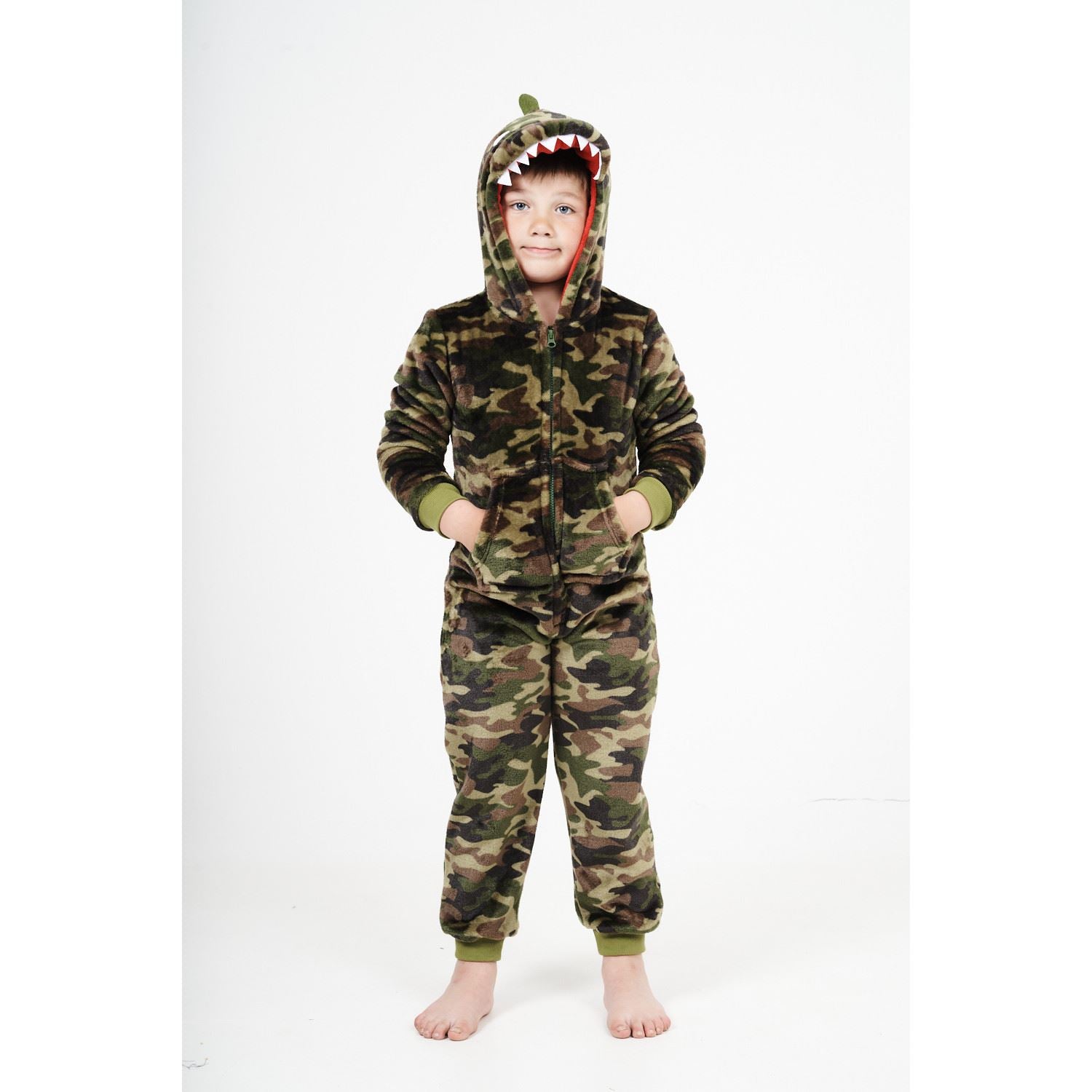 Kids' camo lizard fleece onesie, with a zip up front, novelty hood and pockets.