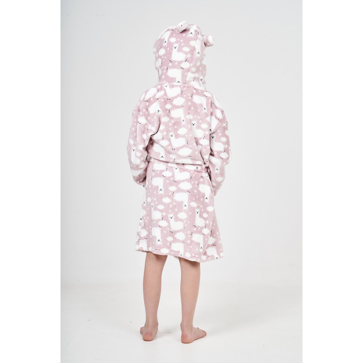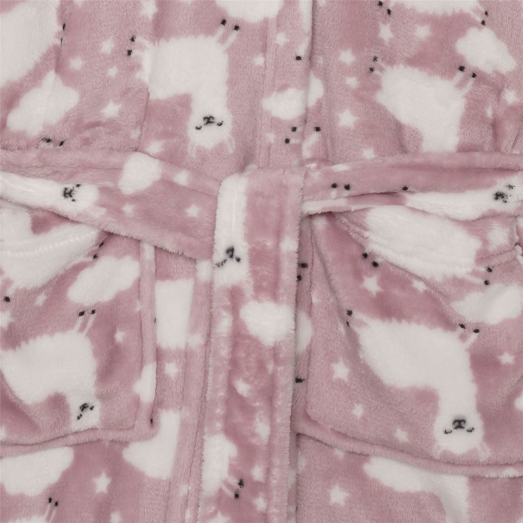 Kids' llama print fleece hooded robe, with a pocket each side and a belt fastening.