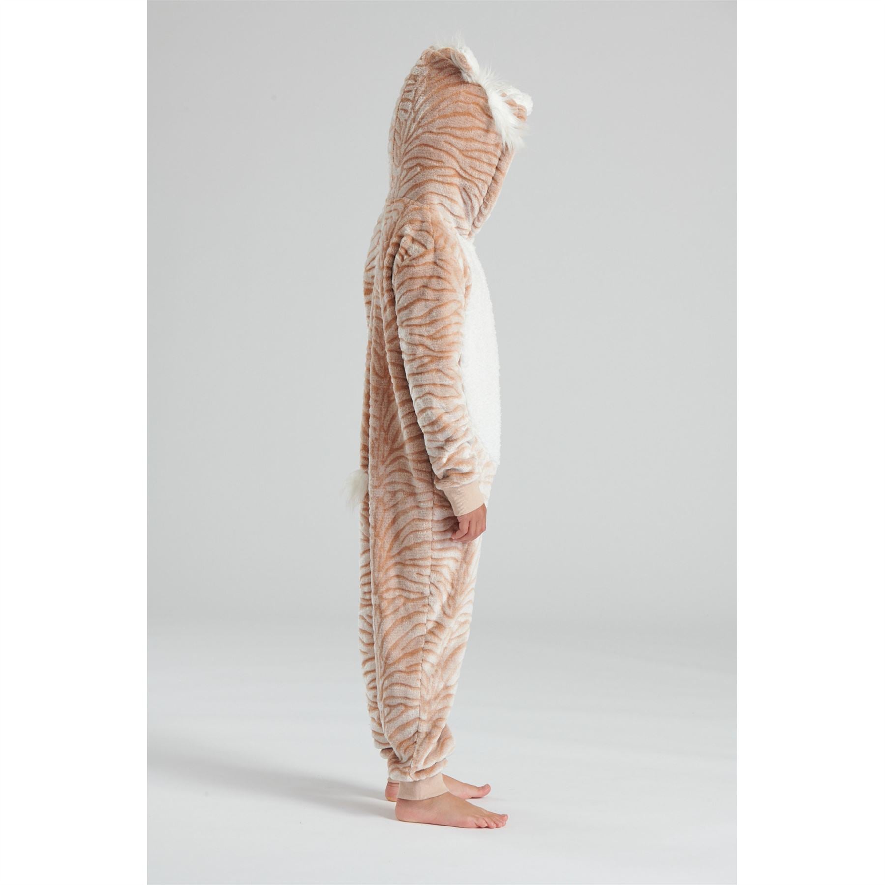 Kids' luxury tiger fleece onesie with a zip up front and 3D hood.
