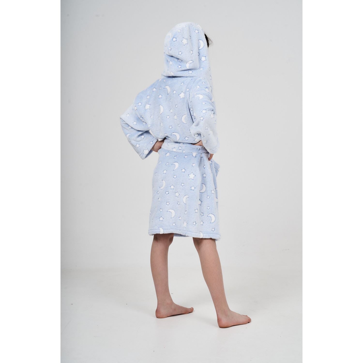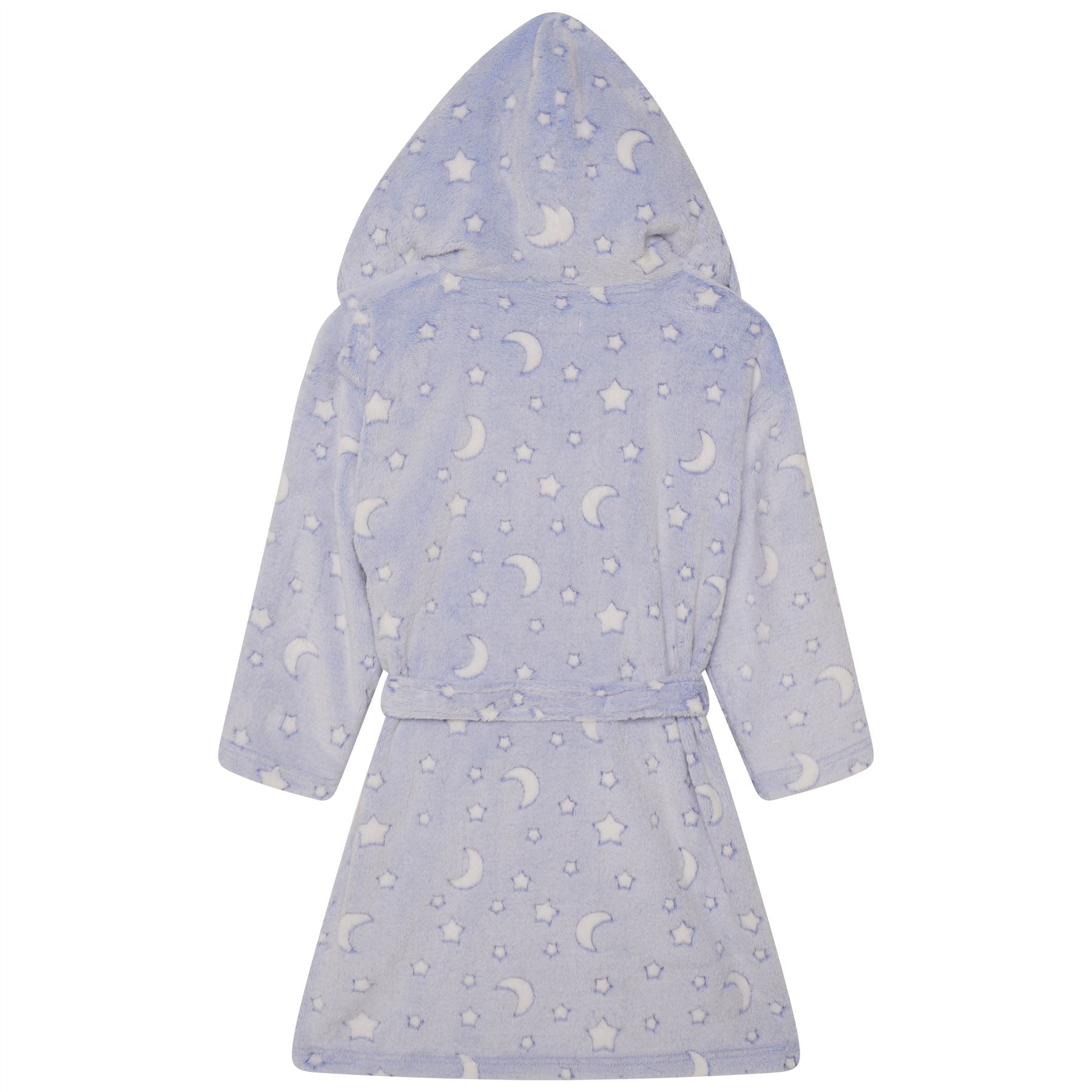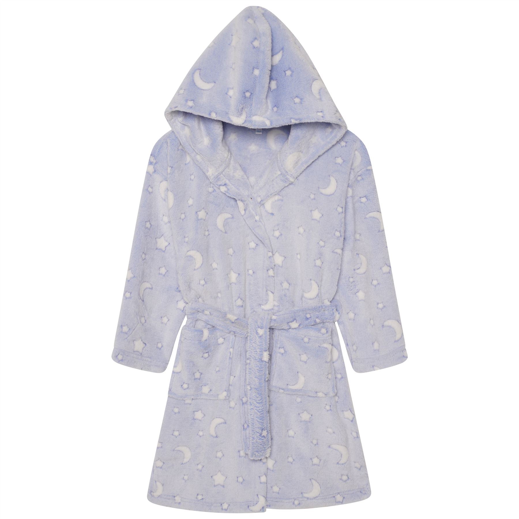 Kids' moon and stars fleece hooded robe, with a pocket each side and a belt fastening.