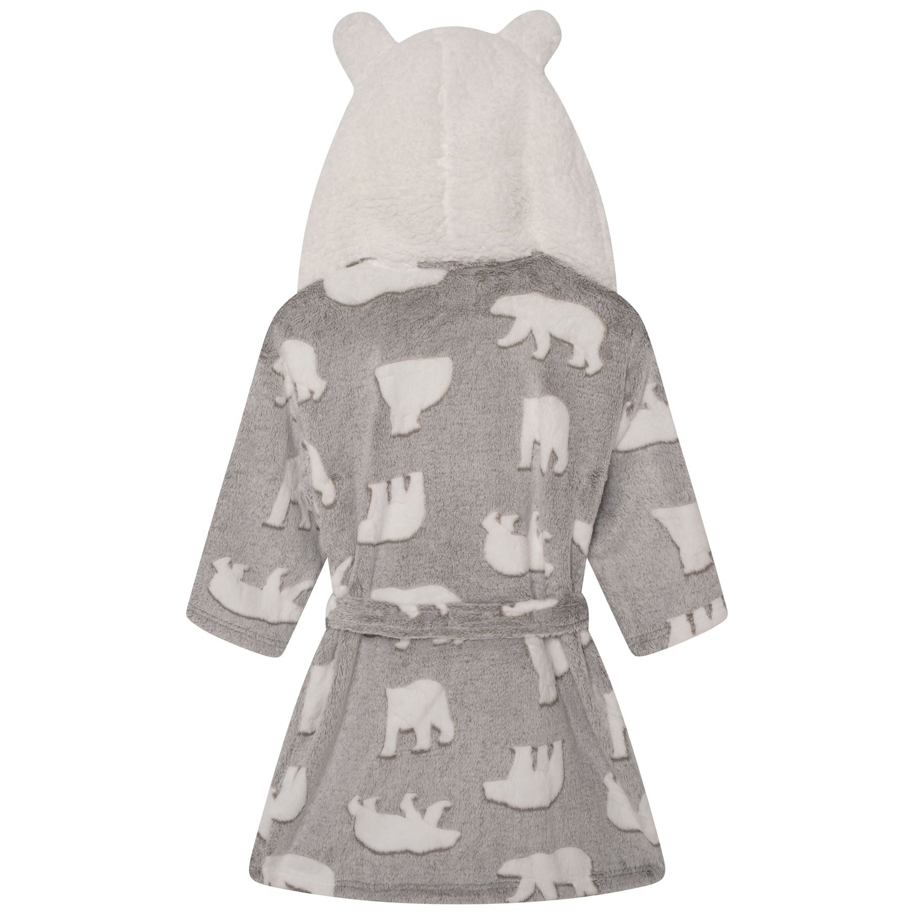 Kids' polar bear fleece robe in grey/white, with a novelty sherpa hood, pockets and a belt fastening.