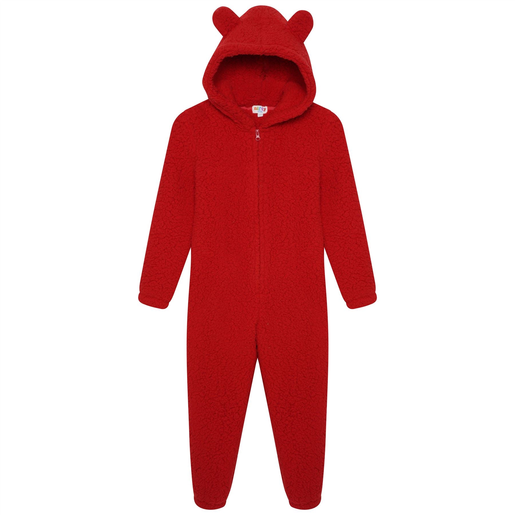 Kids' sherpa fleece onesie in red, with a zip up front and hood.