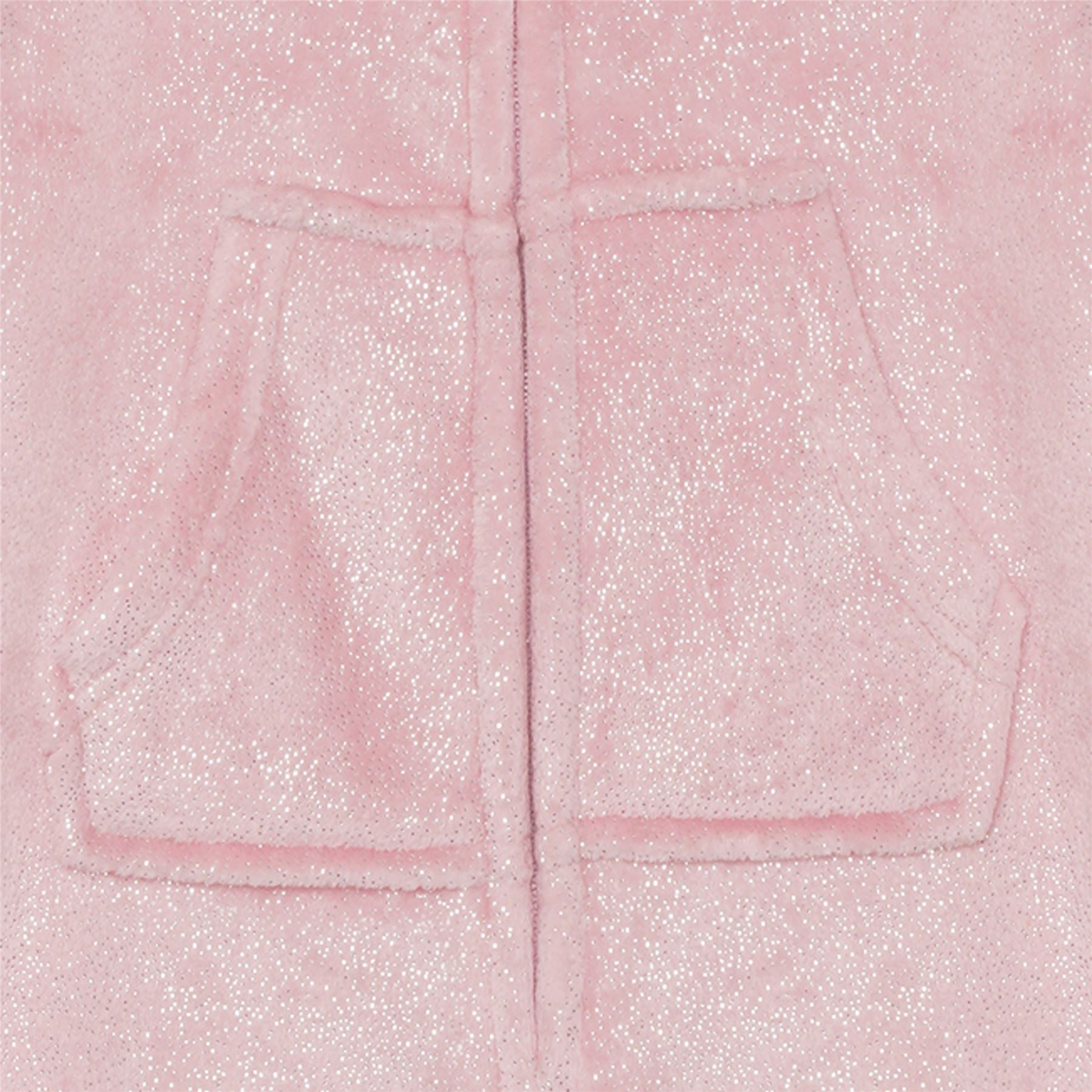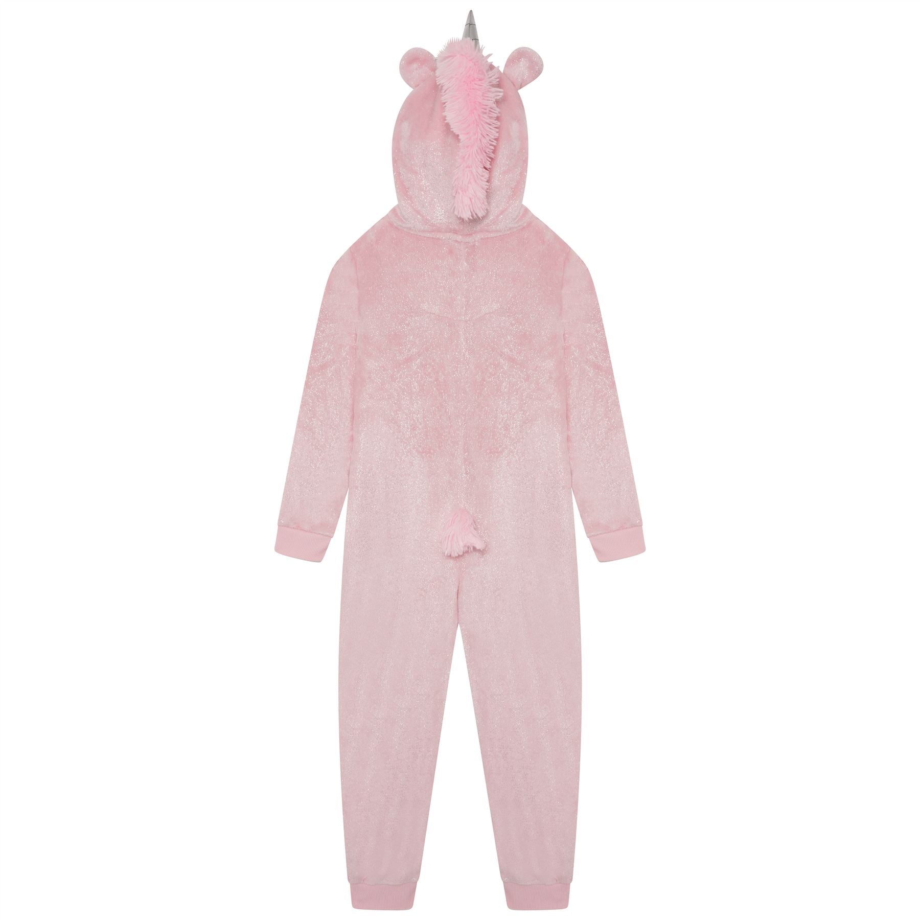 Kids' sparkle unicorn fleece onesie in pink, with a zip up front and novelty hood.