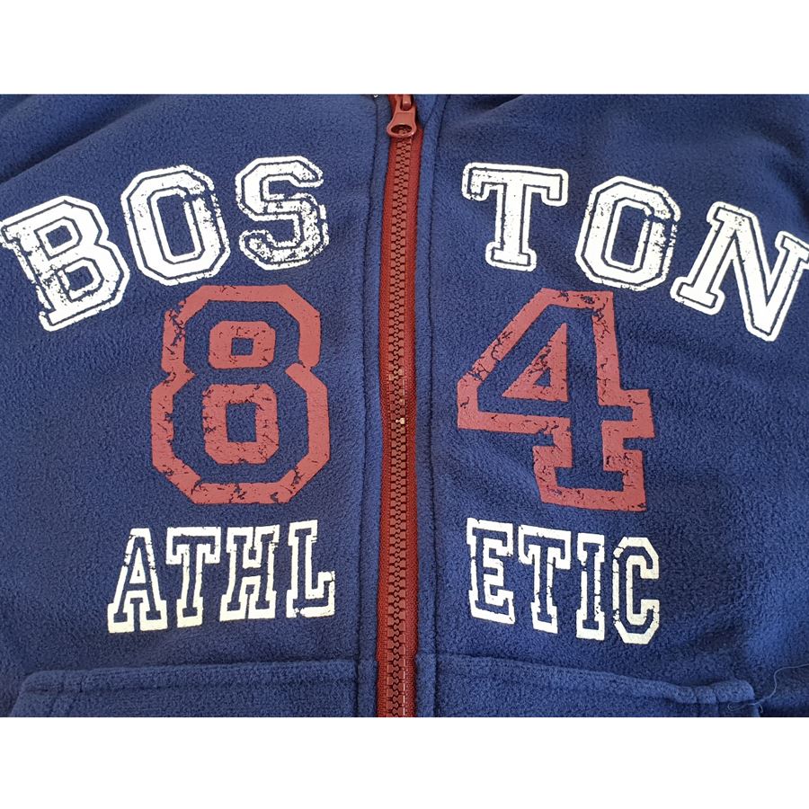 Kids' hooded microfleece onesie in blue, with a weathered effect logo design and zip up front.