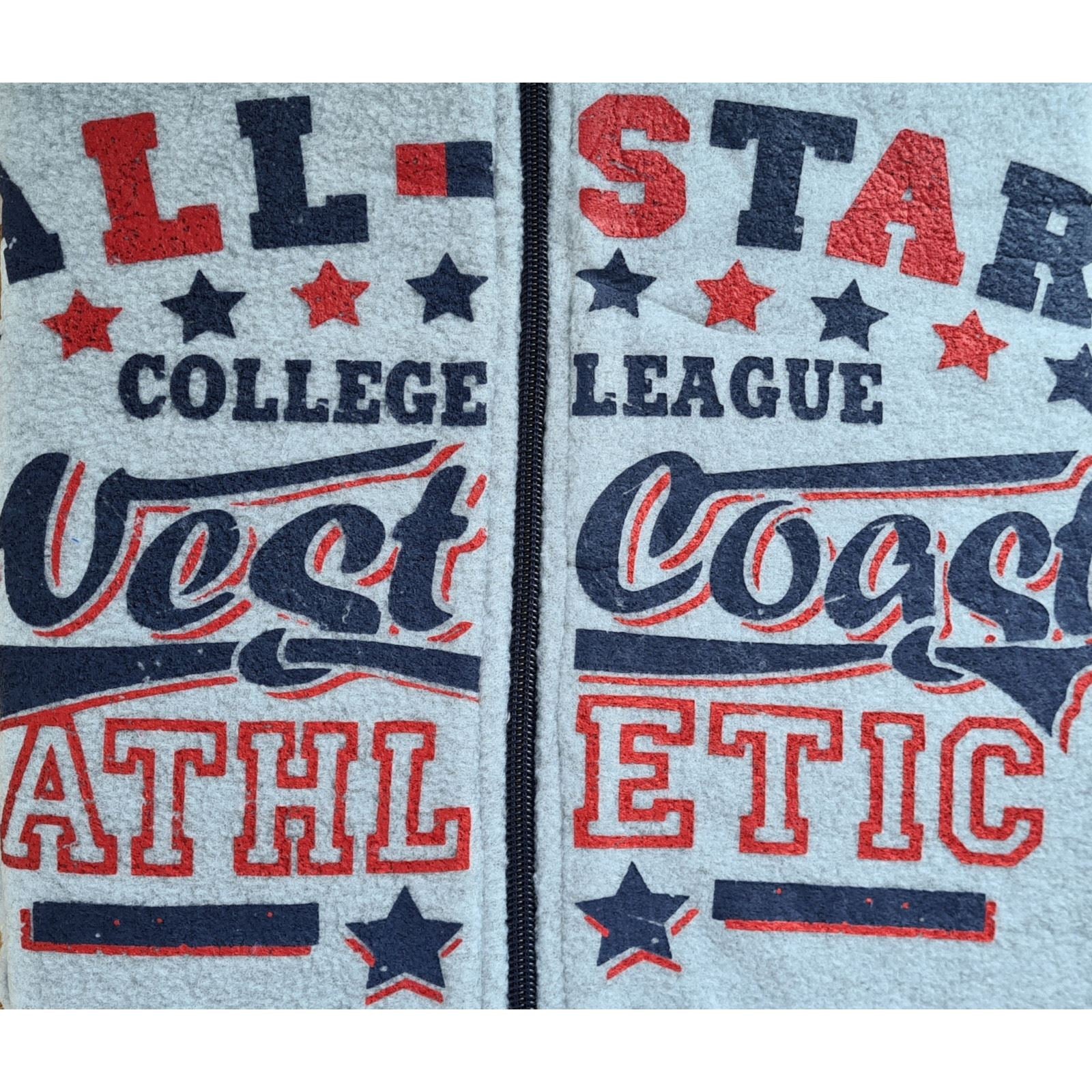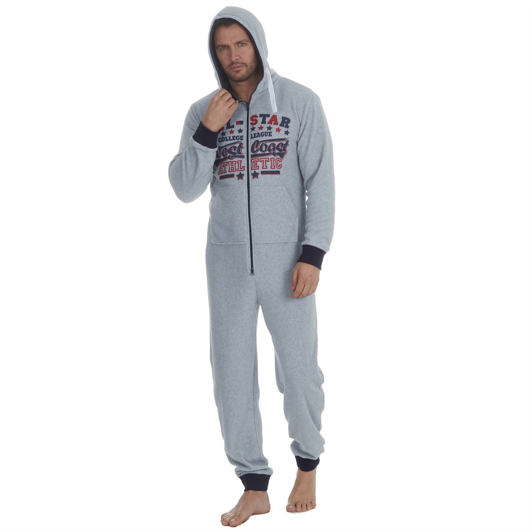 Men's distressed logo print microfleece onesie with a hood, in grey. It has a zip up front and ribbed cuffs and ankles.
