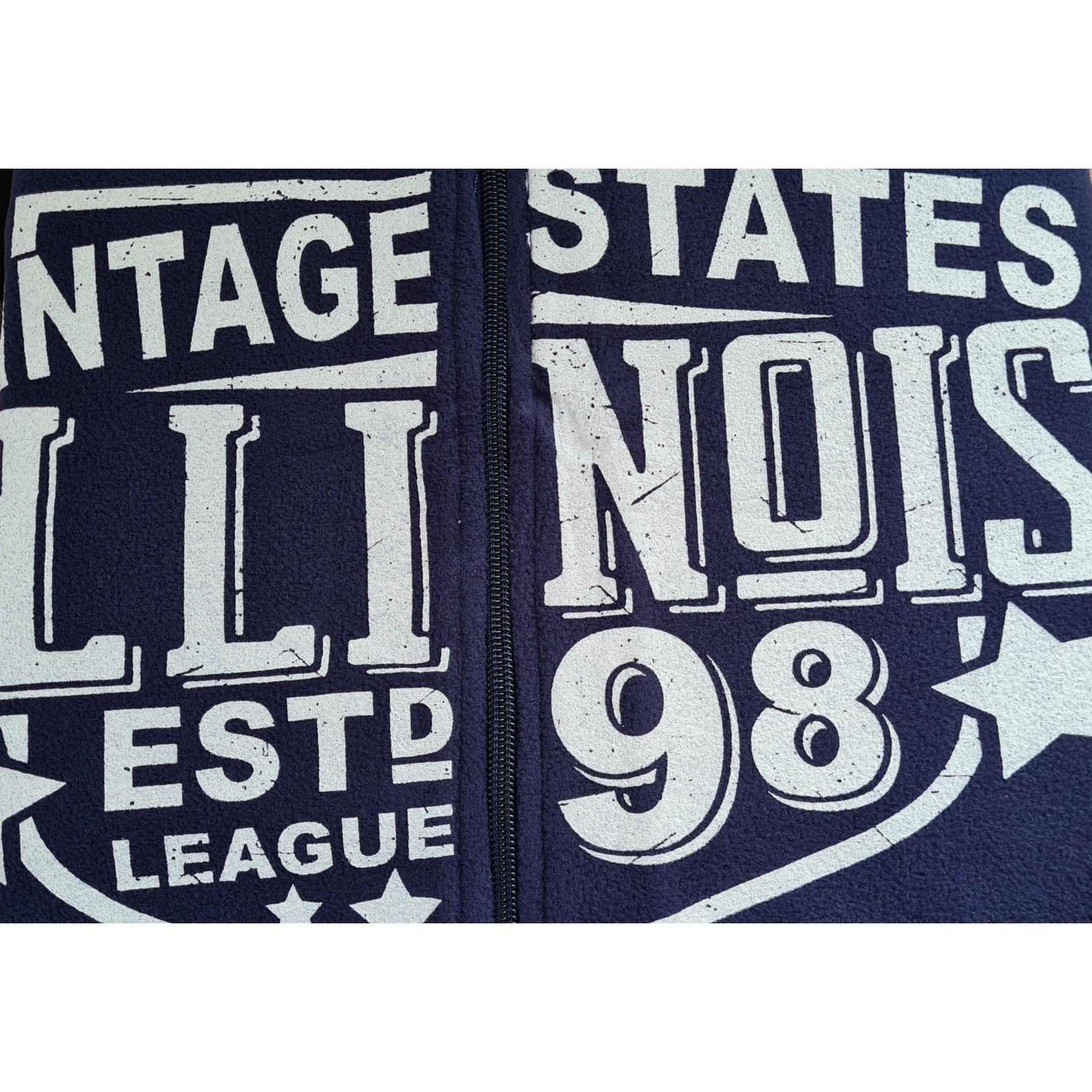 Men's distressed logo print microfleece onesie with a hood, in navy. It has a zip up front and ribbed cuffs and ankles.