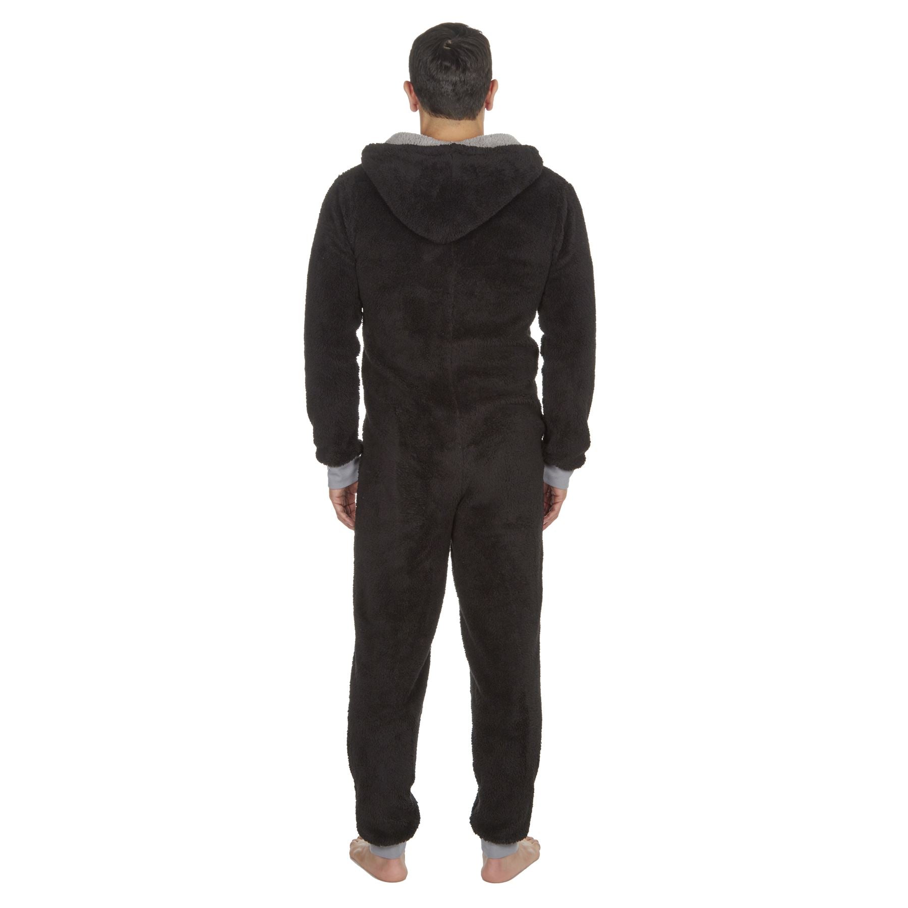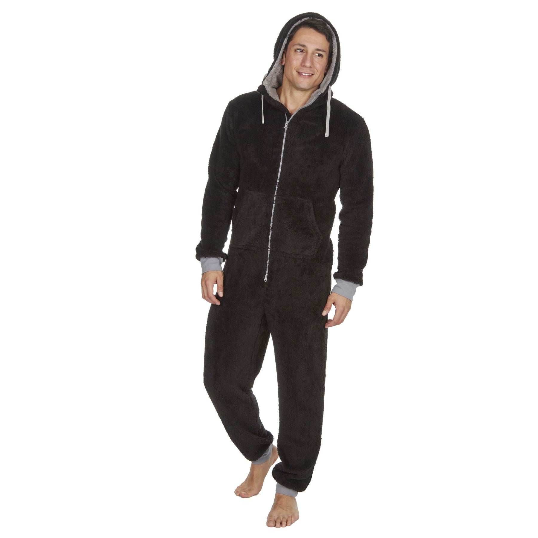 Men's snuggle fleece hooded onesie in black, with a zip up front.