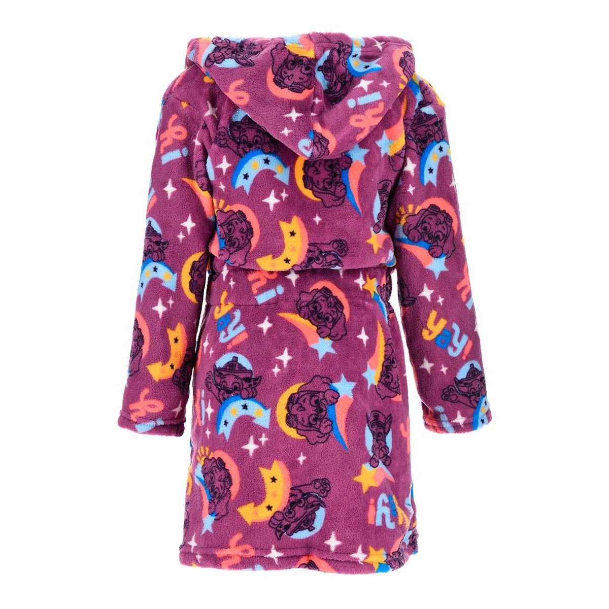 Kids' Paw Patrol hooded fleece robe with printed 'YAY!' detail, in purple. It has pockets and a matching tie belt.